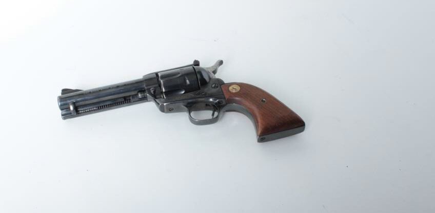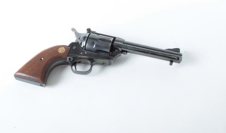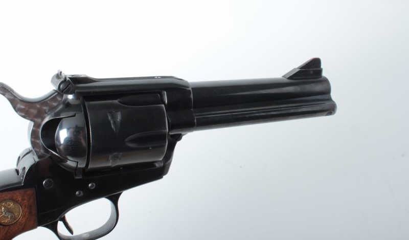 .357 Magnum caliber, 4.75” barrel, blued finish, customized wood Colt gold medallion grips, S/N 28948SA, in overall very good to fine condition as customized; fine bore, fine action with jeweled hammer, sharp markings, adjustable rear sight; very good grips that have been slimmed. (Modern/PPT). Est.: $700-$1,400.