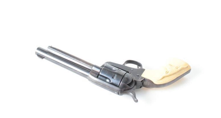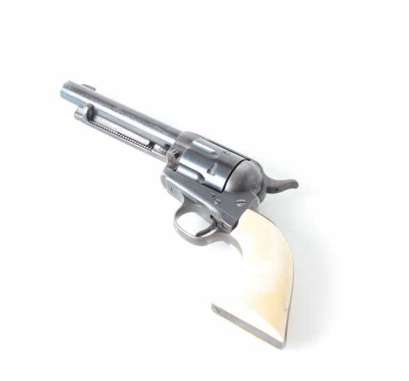 frame, .38 Special caliber, 5.5” barrel, blued re-finish, simulated raised ivory steerhead grips, S/N 237703, in overall good to very good condition showing freckling to the finish on the barrel, very good bore, crisp action, sharp markings and fair replacement grips showing an old chip and crack to the top of the left grip. (Modern/PPT). Est.: $800-$1,600.