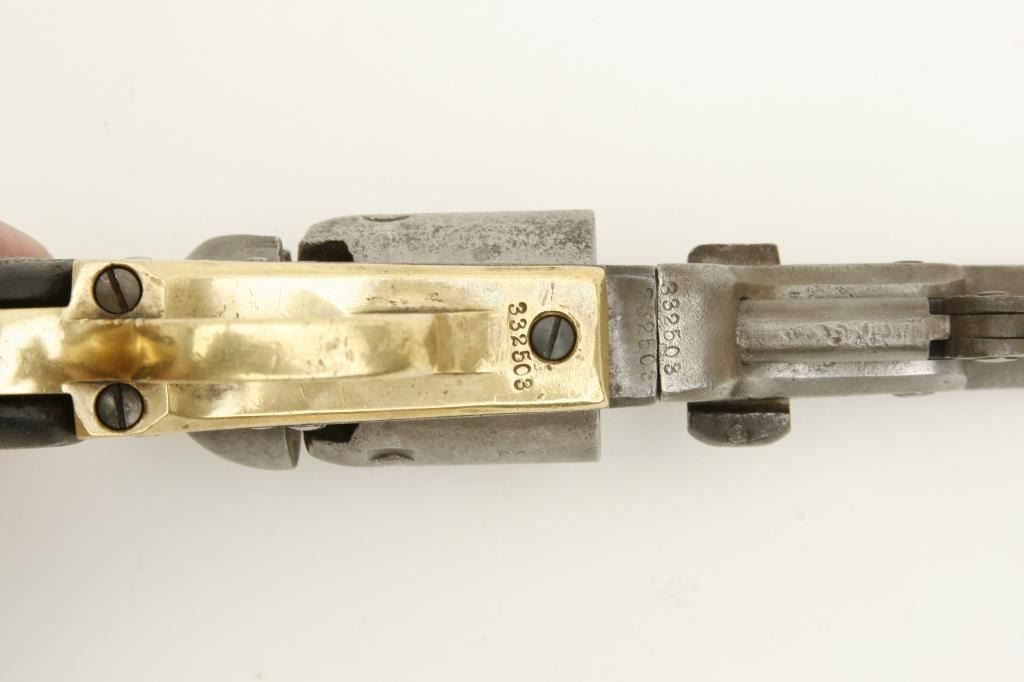 #332503. The pistol is in good overall condition with a 4” octagon barrel. The pistol is a silver patina with light to moderate pinprick pitting noted. The barrel address is light and almost entirely legible. The loading lever has an old brass repair evident. The cylinder scene is gone but the serial number is there. All visible serial numbers match with an unmarked wedge added. The action functions intermittently and all nipples are present. The pistol features brass straps and smooth wood grips with losses at the toe on both sides. The grips are loose, show mars and compressions but are in good overall condition. (Antique) Est.: $500-$1,000.