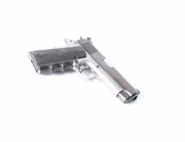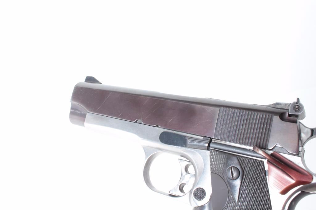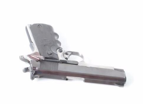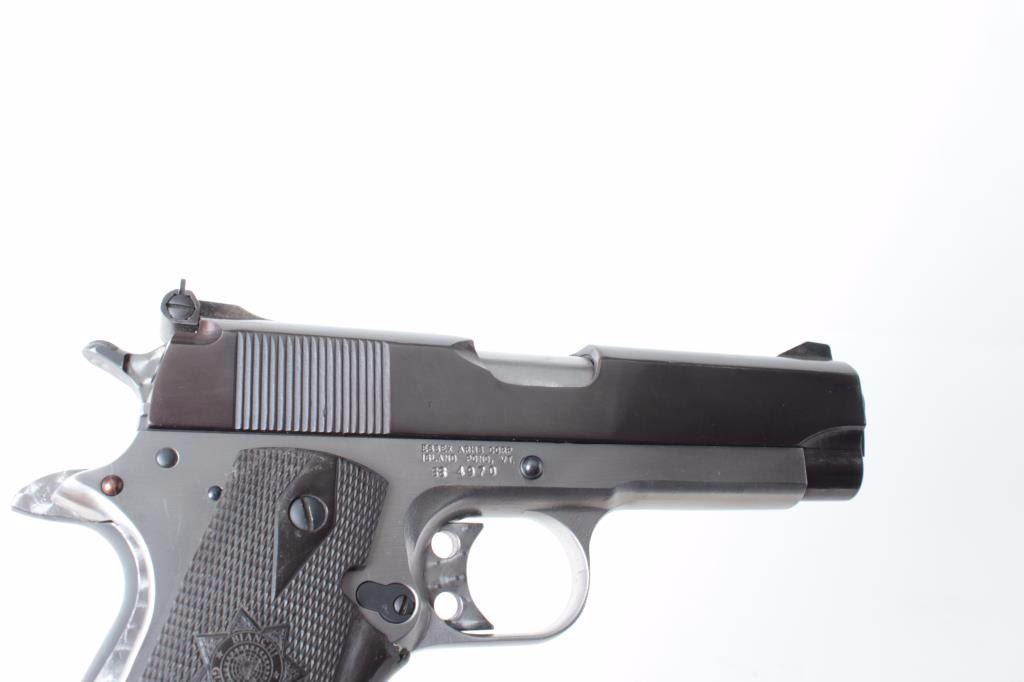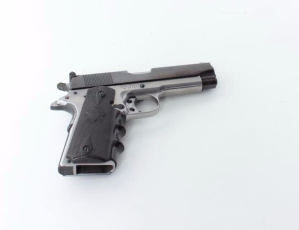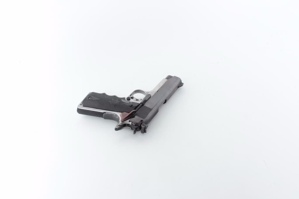 frame, .45 caliber, re-blued slide, checkered Bianchi hard rubber finger groove grips, S/N SS4970, jeweled action, ramped & ported per consignor, no magazine, in overall very good to near fine condition with a crisp action, bore, markings and grips. (Modern/PPT). Est.: $500-$1,000.