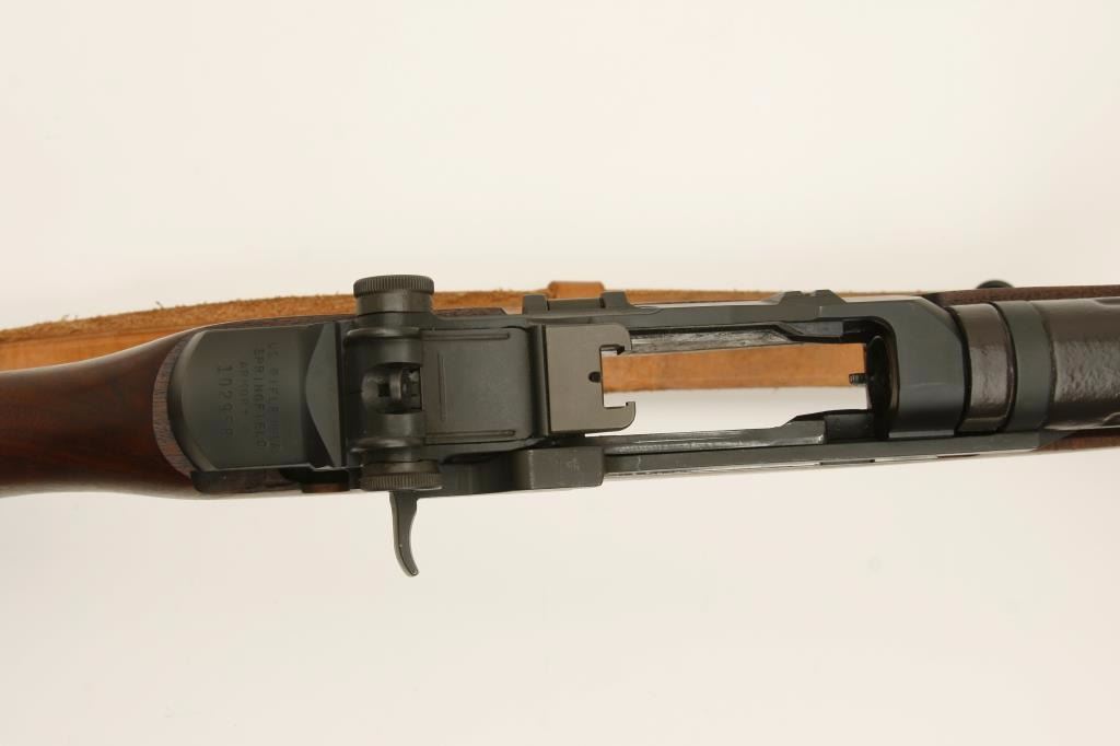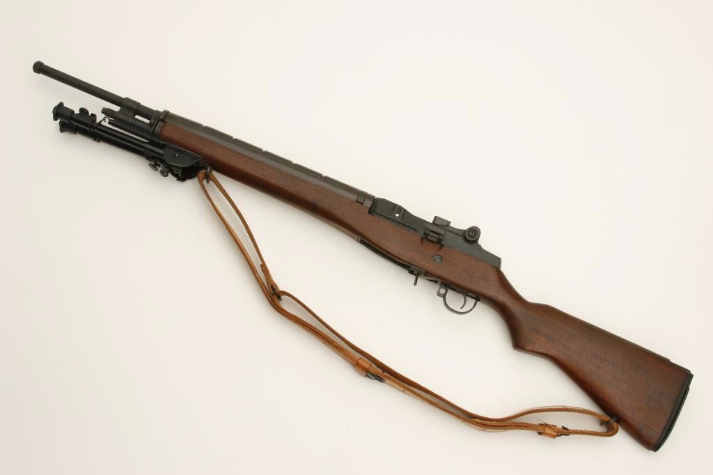 serial #102958. The rifle is in very good overall condition. The barrel retains nearly all of its military finish, as does the receiver. The muzzle break has been removed and accompanies the rifle in a separate bag. The smooth wood stock is in very good condition showing only slight handling marks. The stock has a Harris style bipod added and ends with a checkered steel butt plate. The bore is dirty, but should clean to good. The action functions and the markings are legible. A leather, military sling and sling swivels have been added. (Modern) Est.: $800-$1,600.