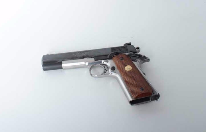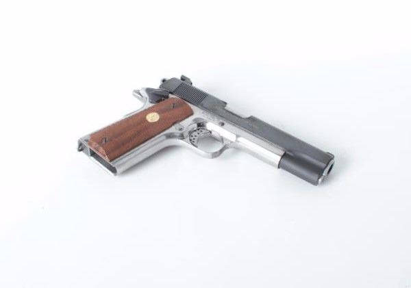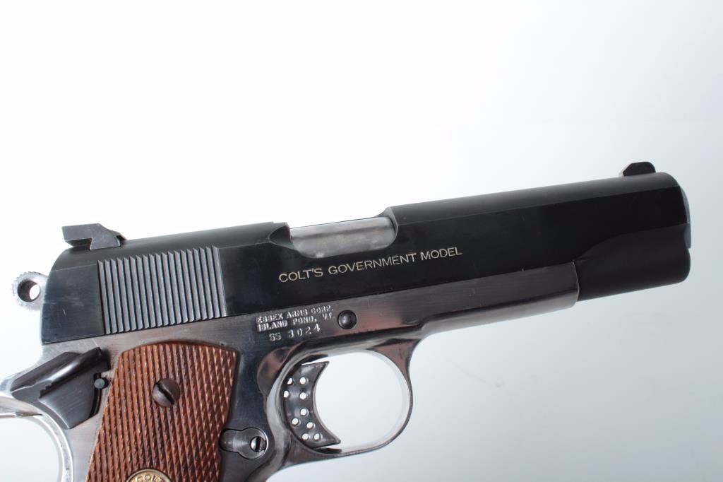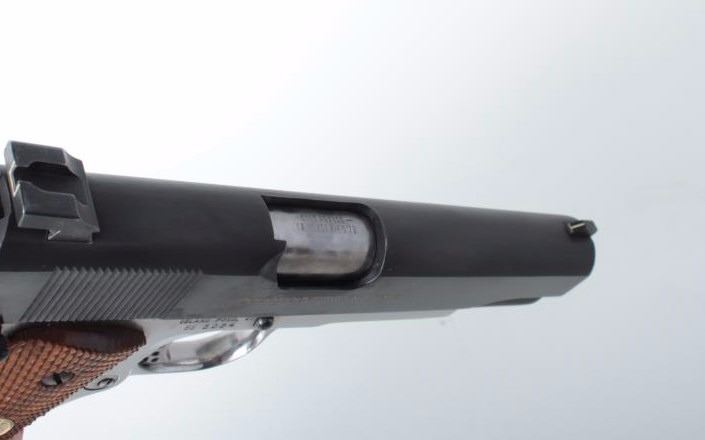 caliber, 5” barrel, Colt MK IV/Series 70 slide, no magazine, Colt checkered wood medallion grips, some non-Colt parts including S&W sights, S/N SS3024, in overall very good condition; crisp action, very good bore, fine grips. (Modern/PPT). Est.: $500-$1,000.