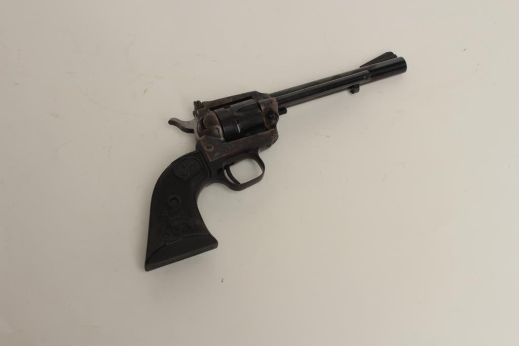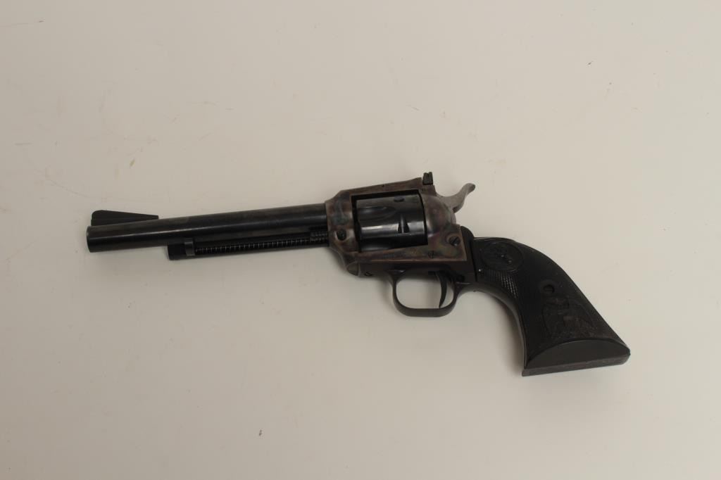 extra .22 Magnum cylinder, 6” barrel, blued and case hardened finish, checkered eagle plastic grips, S/N G151722, like new in the factory wood grain cardboard box, numbered to this gun and with inserts and instructions. (Modern/PPT). Est.: $400-$800.