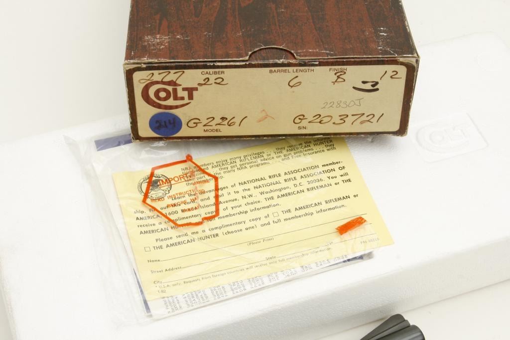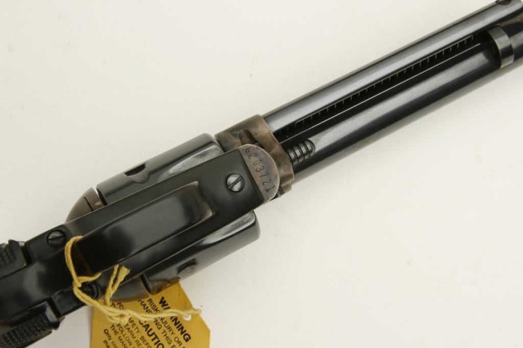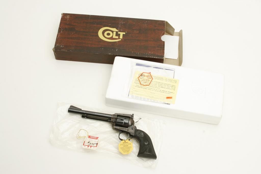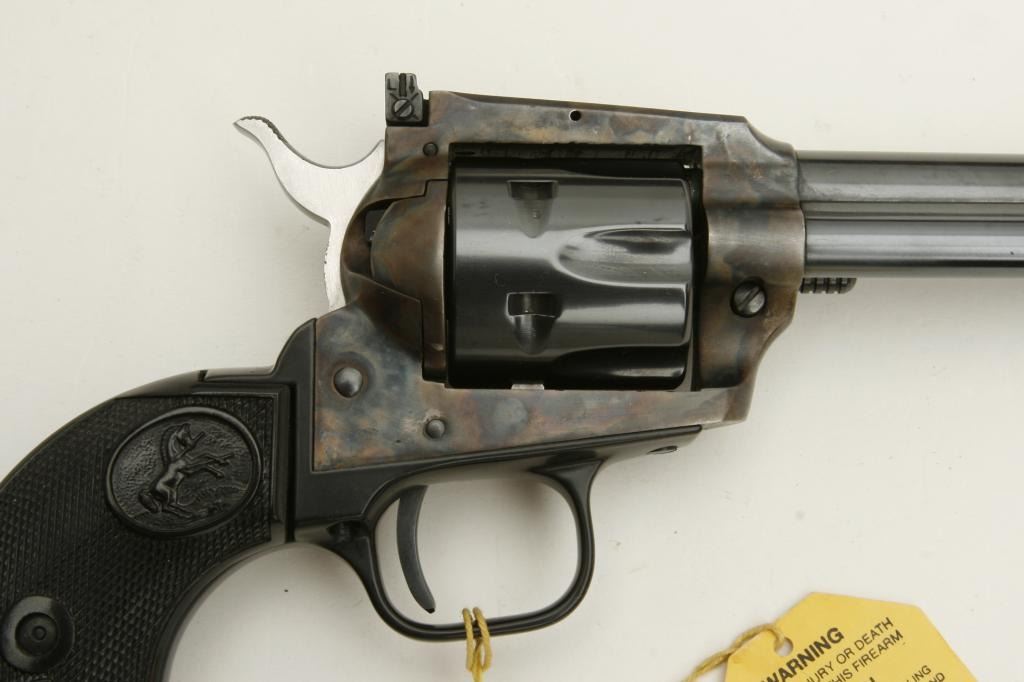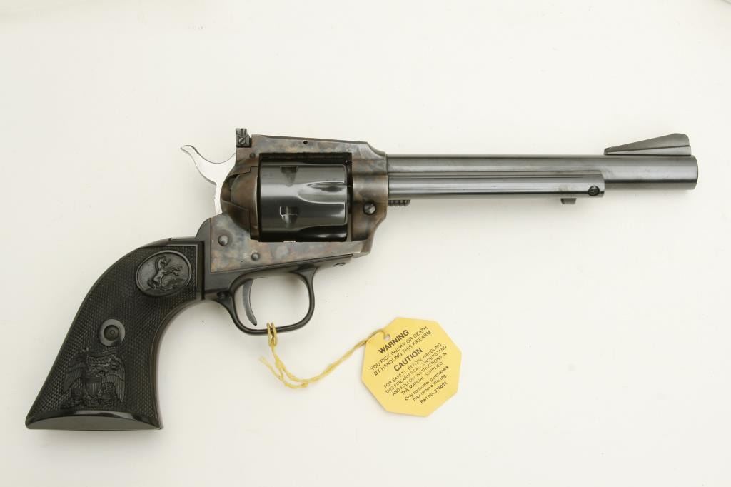 caliber, 6” barrel, blued and case hardened finish, checkered eagle plastic grips, S/N G203721, in like new condition in factory wood grain cardboard box, inserts and instructions. Box is numbered to this gun. (Modern/PPT). Est.: $350-$700.