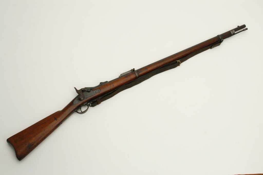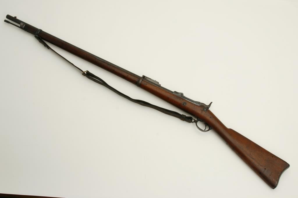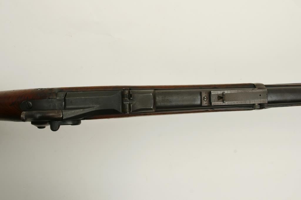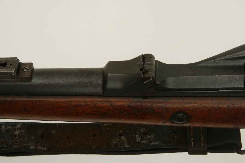 serial #NSNV. The rifle is good overall condition with a 32” barrel. The barrel and receiver appear to have been arsenal re-finished during the period of use and both retain significant amounts of their blued finish. The smooth wood stock shows considerable use with numerous dings, dents and compressions but remains in good condition. The butt stock ends with a smooth, crescent butt plate and features a circle P cartouche behind the trigger guard. The bore is good, the action remains crisp and the markings are legible. The lot includes a period leather military sling as well. (Antique) Est.: $275-$550.