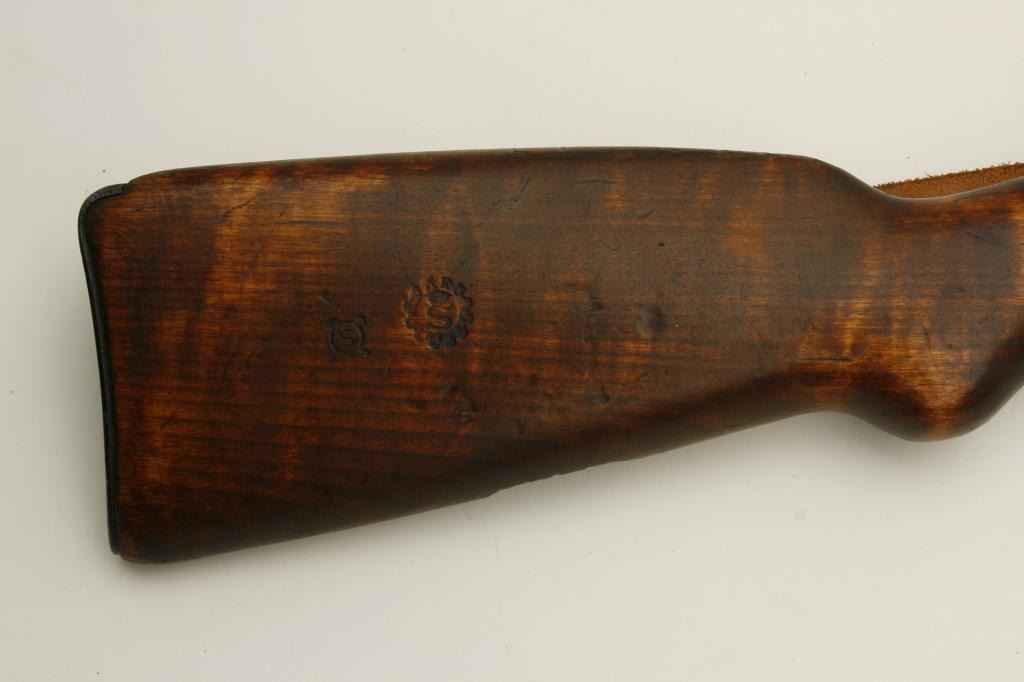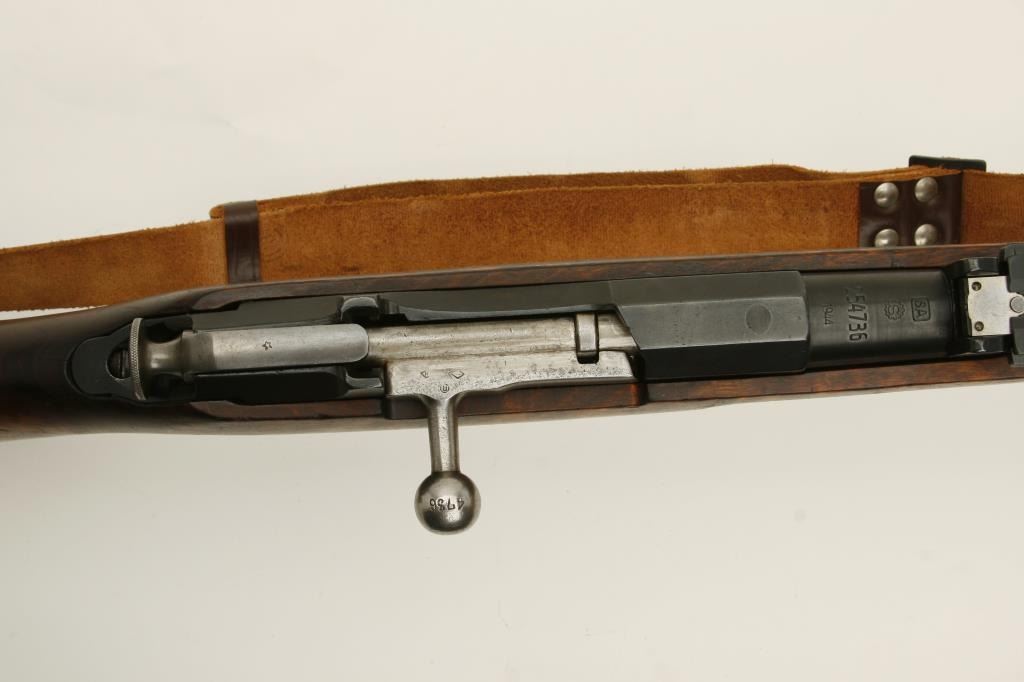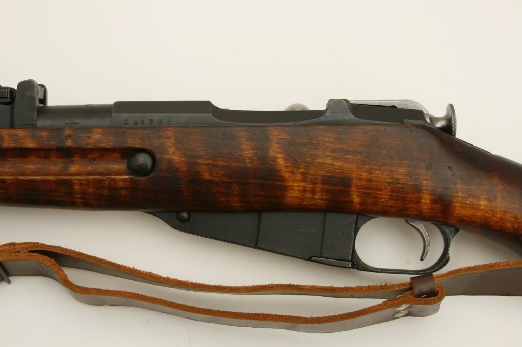 serial #254736. The rifle is in good to nearly very good overall condition with a 28” barrel. The barrel and receiver retain nearly all of their military finish with clear, sharp markings and a military style tangent rear sight. The barrel is import marked at the muzzle and the receiver is dated 1944. The smooth wood stock is in good condition showing wear and use but with two cartouches on the right side and a smooth metal butt plate. The rifle also features sling swivels and leather, military style rifle sling. The bore is good, the action crisp and markings are sharp on this World War II era Russian rifle. (C+R) Est.: $200-$400.