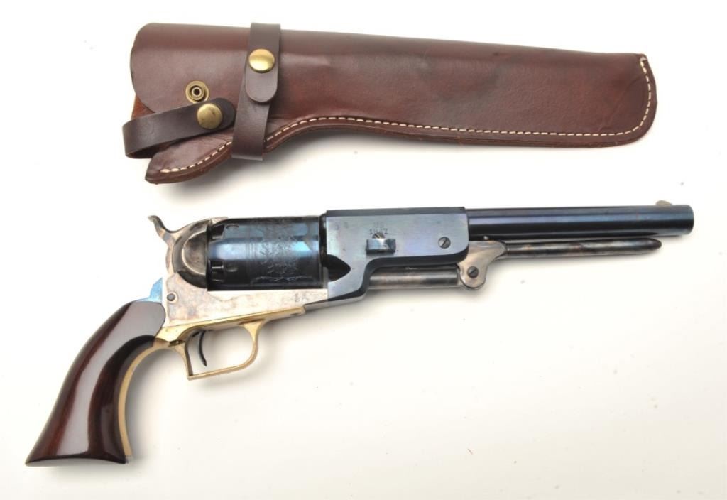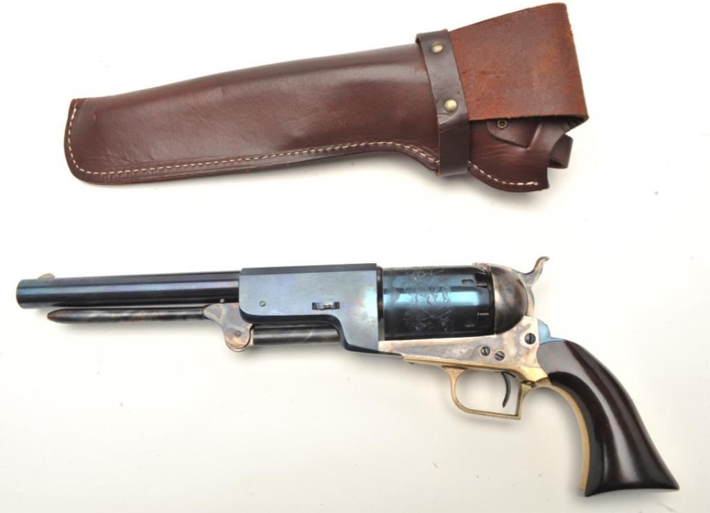 .44 caliber, blued and case hardened finish, wood grips, S/N 08323, in near new condition and accompanied by a brown leather holster. (Percussion). Est.: $200-$400.