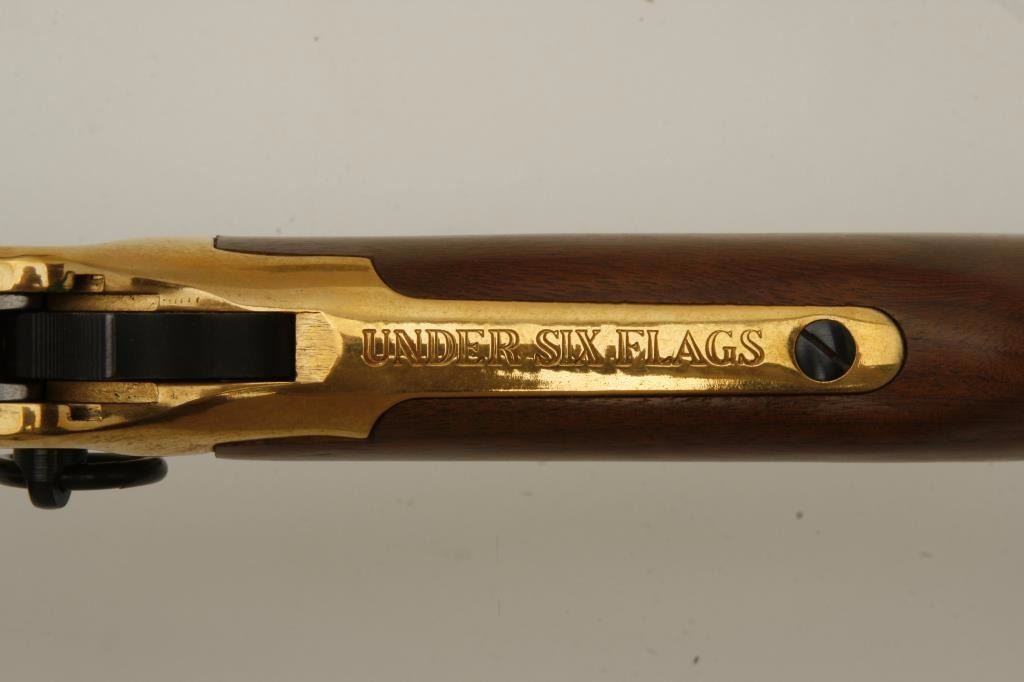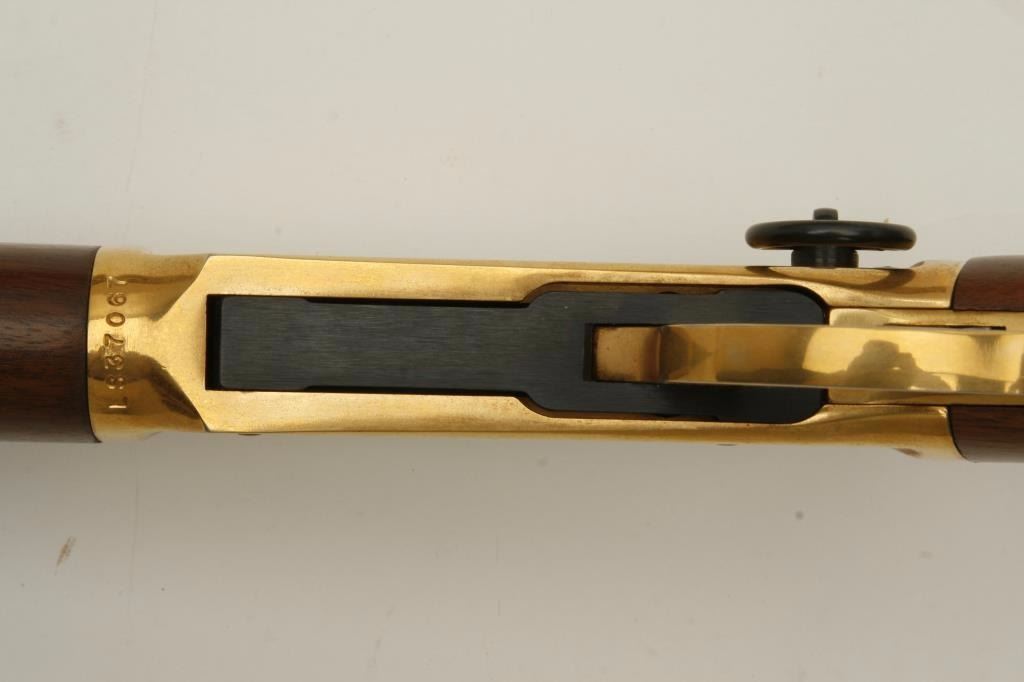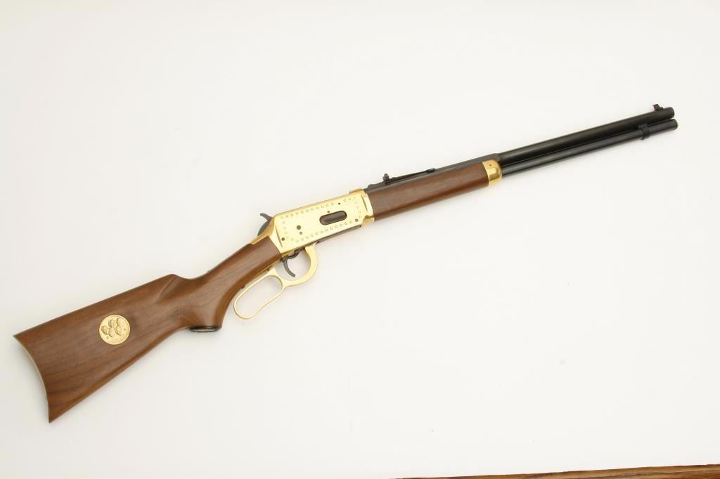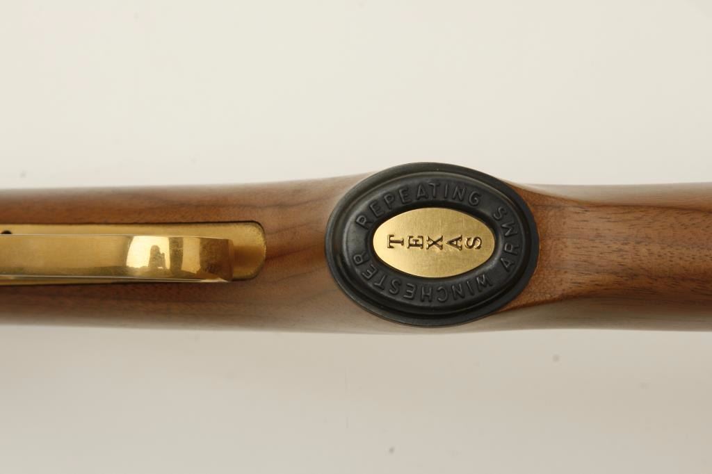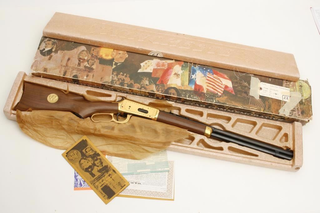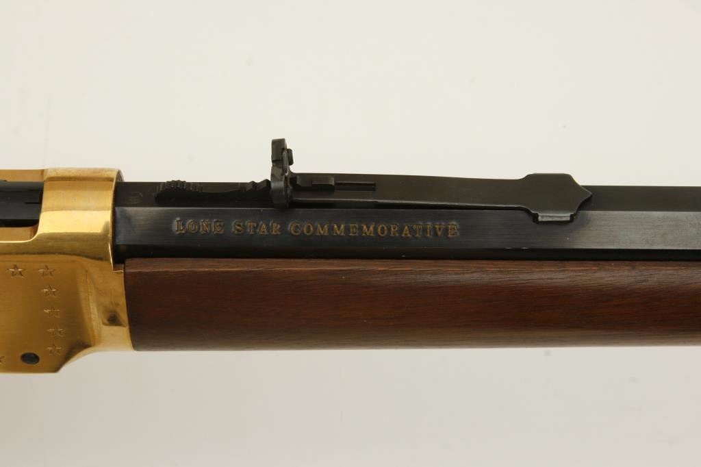 carbine, 30-30 caliber, serial #LS37067. The carbine is in very good condition with a 20” half round/half octagon barrel. The barrel is marked Lone Star Commemorative, the receiver, “1845-1970”. The carbine has a blued barrel and magazine while the receiver, lever and butt plate are polished brass with the saddle ring blued. The smooth wood stocks are in very good condition with small mars from handling only. The carbine is the original box with all associated inserts and packaging materials, with the original cardboard sleeve. The butt stock has a brass commemorative medallion inset into the butt stock and features a pistol grip. (Modern) Est.: $400-$800.