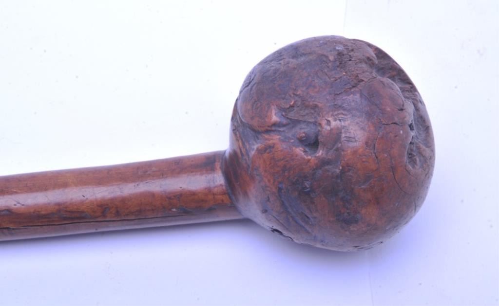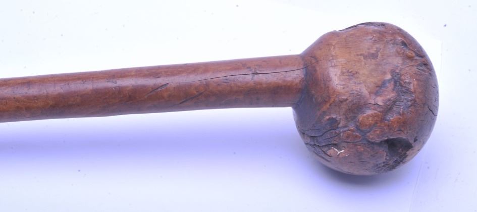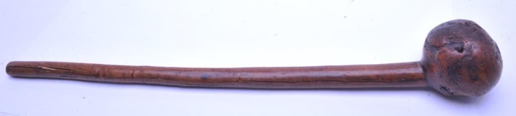 tribes and 18th to early 19th century. Measures 27” overall. Fair condition to good. Some cracks and losses. Light colored wood possibly maple with slight fiddleback. Est.: $300-$600