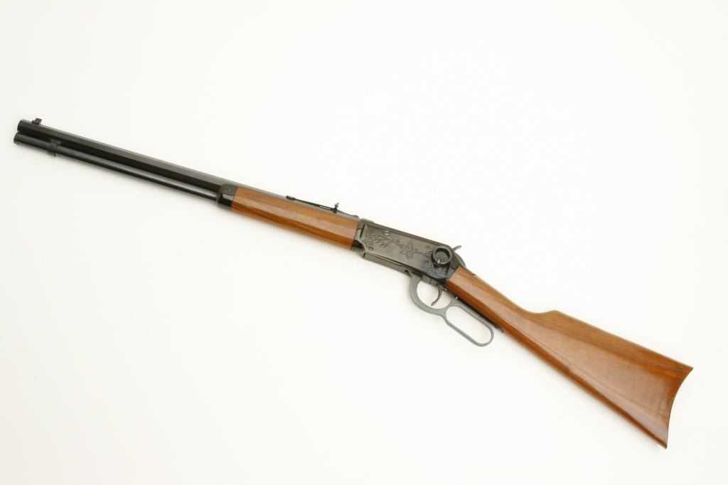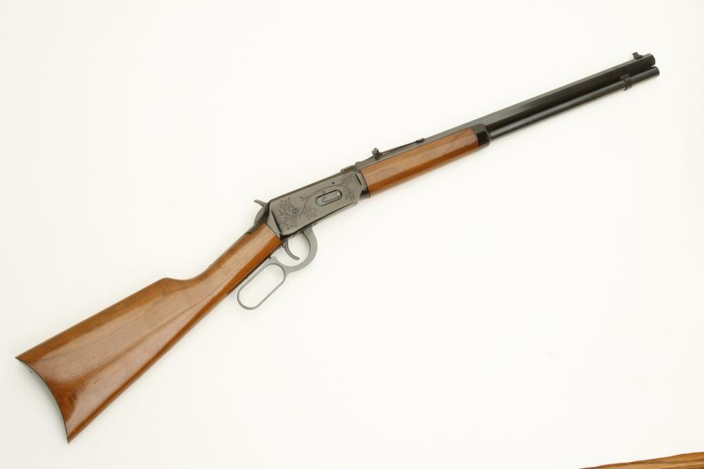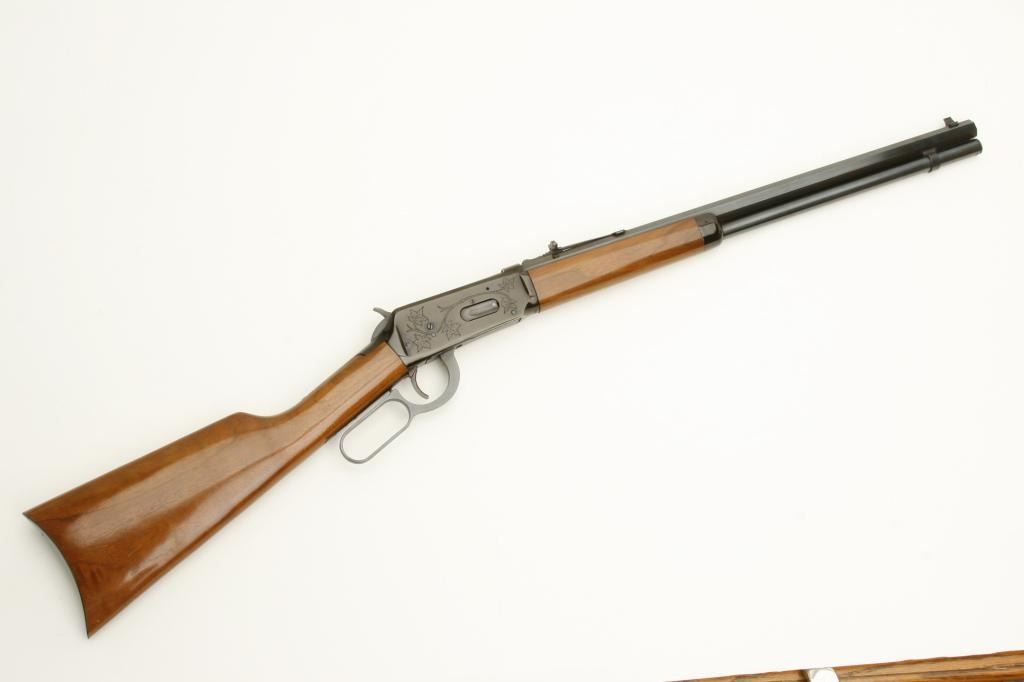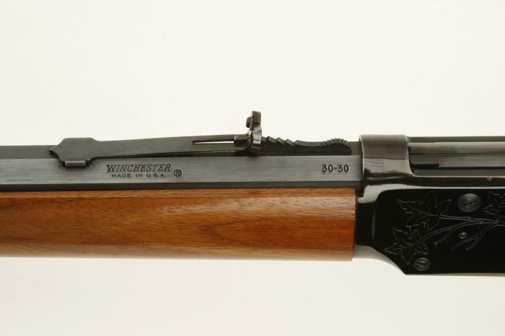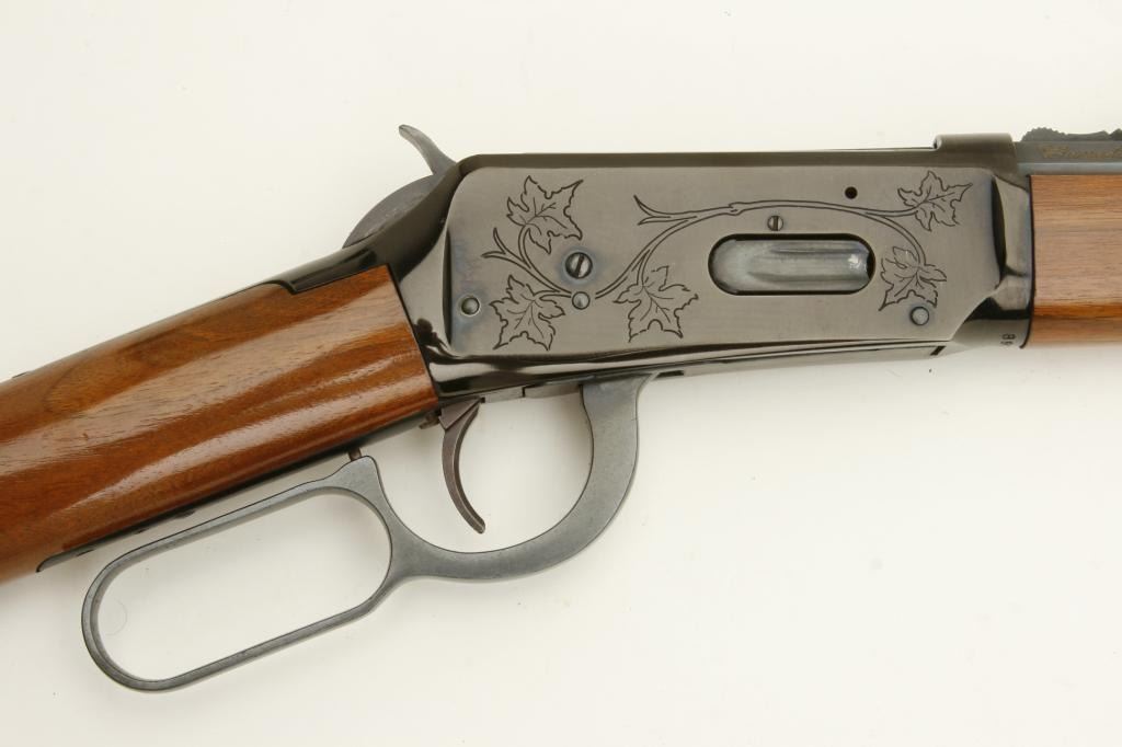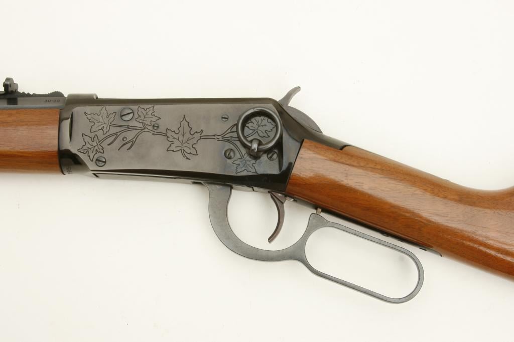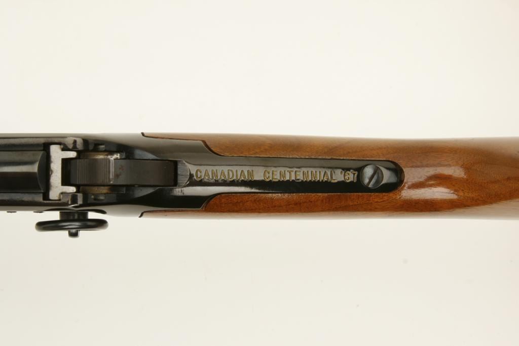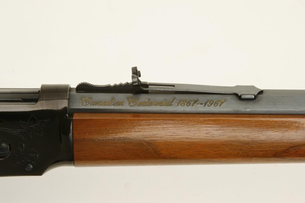 30-30 caliber, serial #89795. The rifle is in very good overall condition with a 20” octagon barrel. The barrel is marked, “Canadian Centennial 1867-1967”. The barrel and full-length magazine retain a significant amount of their original blued finish with slight wear at the muzzle. The receiver has engraving depicting maple leaves and retains the majority of its blued finish. The smooth wood stocks are in very good condition with small mars and handling marks. The butt stock ends with a smooth, metal crescent butt plate. The bore is good, the action sharp and markings are sharp. (Modern) Est.: $300-$600.