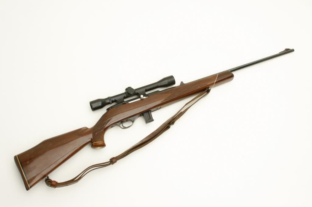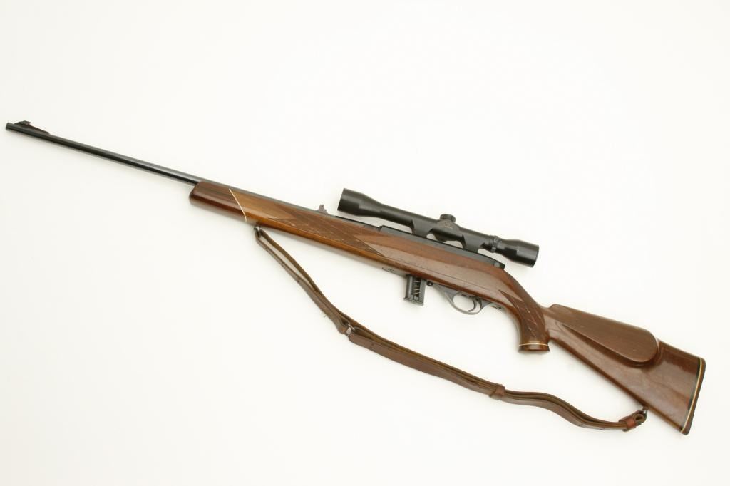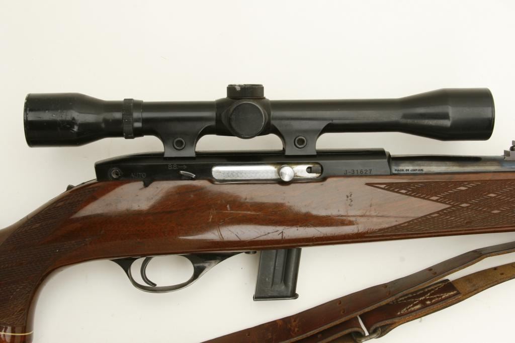 serial #J-31627. The rifle is in good overall condition with a 24” barrel with ramp front and folding rear sights. The barrel and receiver retain the majority of their blued finish with small scratches and muzzle wear noted. The finely checkered wood stock is in good condition showing moderate wear with small dents and scratches noted. The butt stock includes an upgraded fore end cap, exaggerated cheek piece and Weatherby marked rubber butt pad. The rifle is topped with a Weatherby Mark XXII 4x50 fixed power scope in integral mounts and rings. The lot includes a leather military style sling and one magazine. The bore is good, the action crisp and markings sharp. (Modern) Est.: $250-$500.