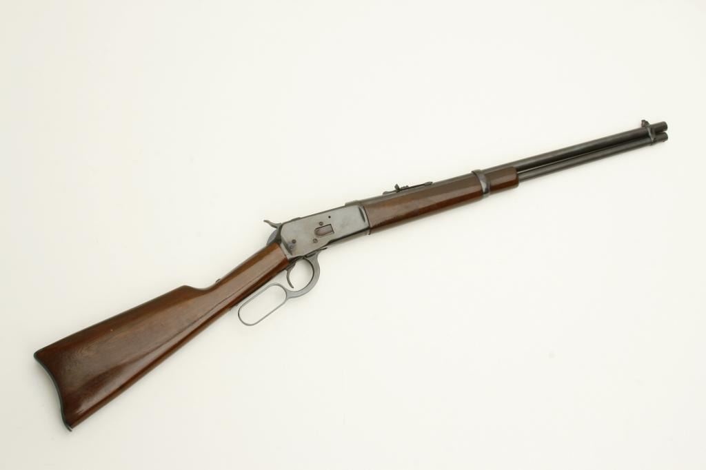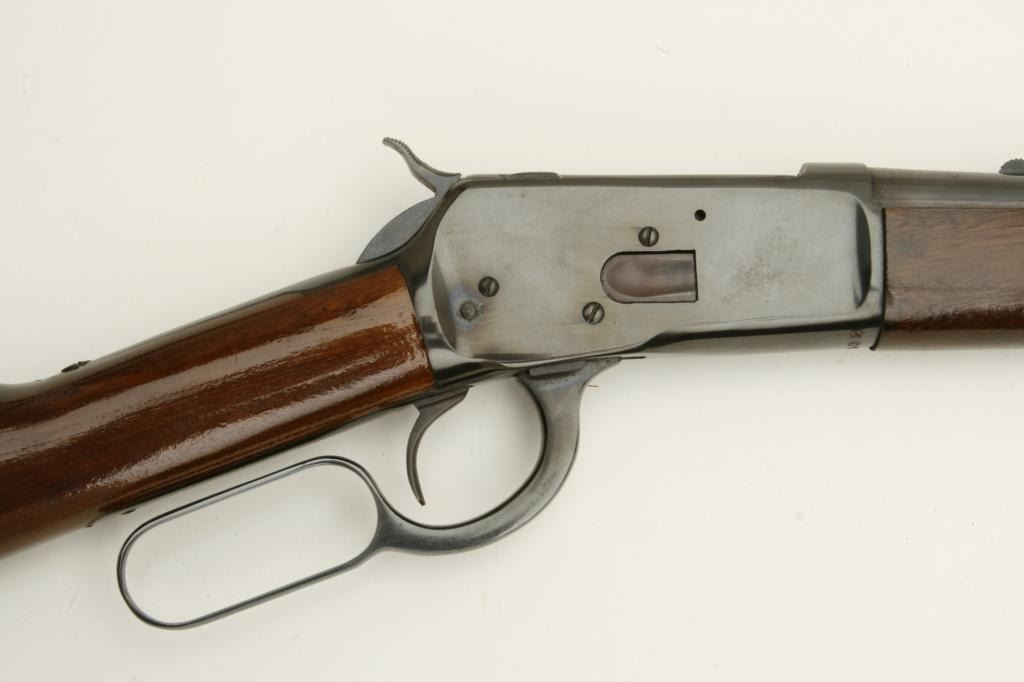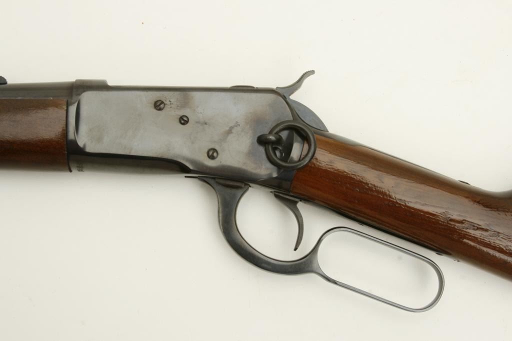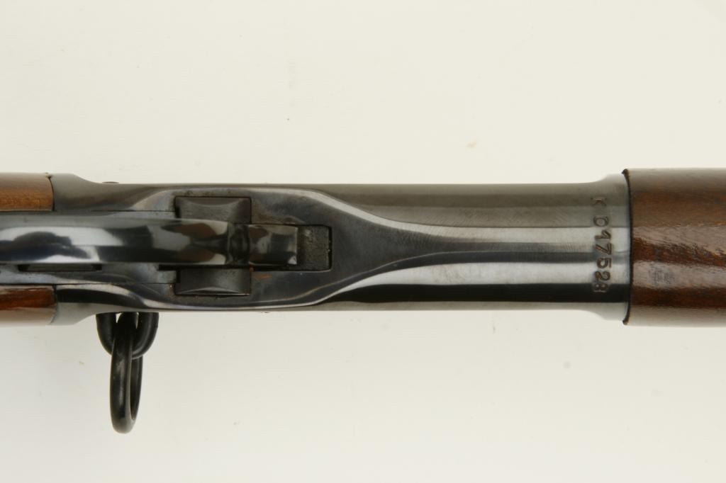 .38 Spl./.357 Mag. caliber, serial #5017523. The carbine is in very good to nearly excellent condition with a 20” import marked barrel. The barrel and full-length magazine retain nearly all of their high polish blued finish. The receiver shows the majority of its blued finish with a small patch of light surface erosion on the left side and saddle ring. The smooth wood stocks are in very good condition with only slight handling marks noted. The butt stock ends with a smooth, metal crescent butt plate. The bore is very good, the action crisp and markings are sharp. (Modern) Est.: $250-$400.
