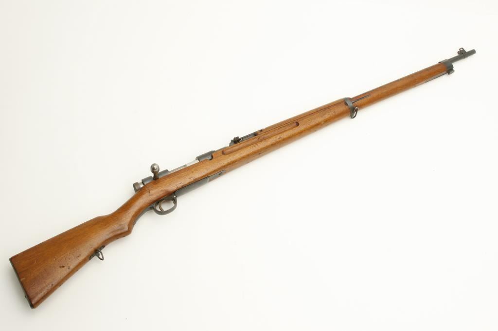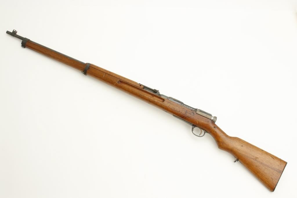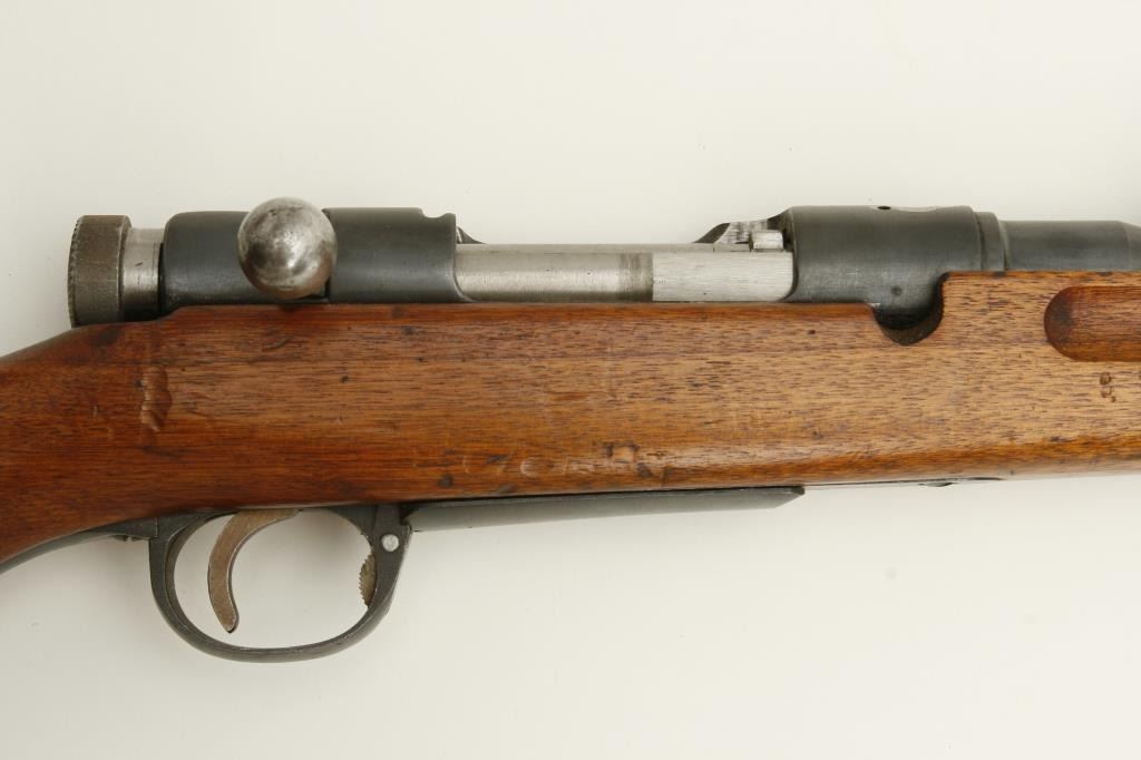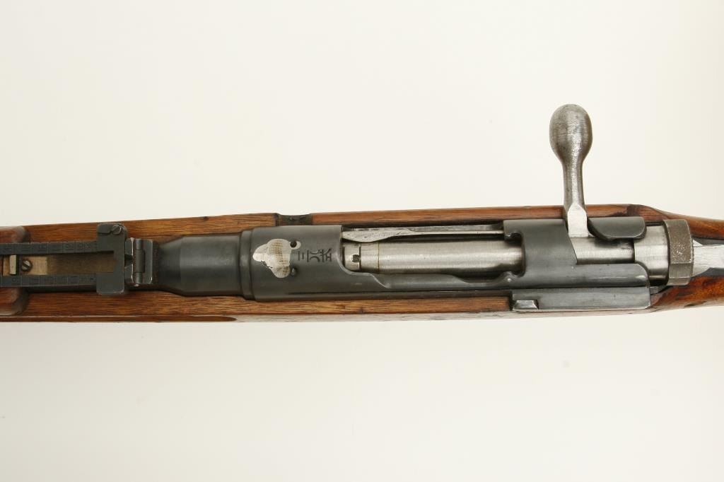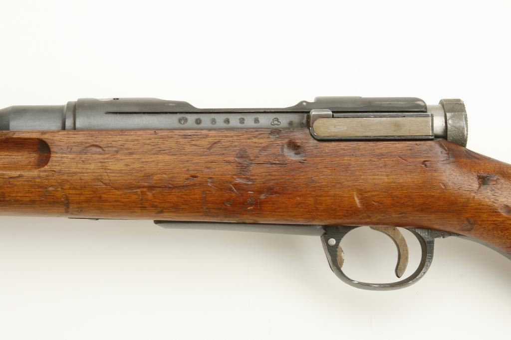 caliber, serial #08625. The rifle is in very good overall condition with a 32” barrel. The barrel and receiver retain the majority of their military finish with wear at the muzzle. The Mum symbol on the front ring has been ground off. The smooth wood stock is in good condition showing wear with small compressions and an “O” cartouche behind the trigger guard. The butt stock includes sling swivels and ends with a smooth metal butt plate. The bore is good, the action crisp and markings are sharp. (C+R) Est.: $100-$200.