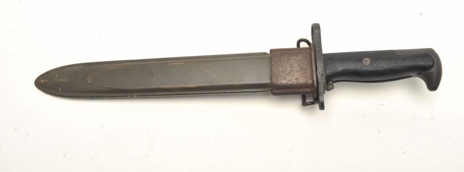 clipped point by Utica Cutlery from WWII. Very good blade and grips. Good scabbard. Est.: $75-$150