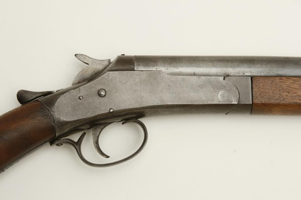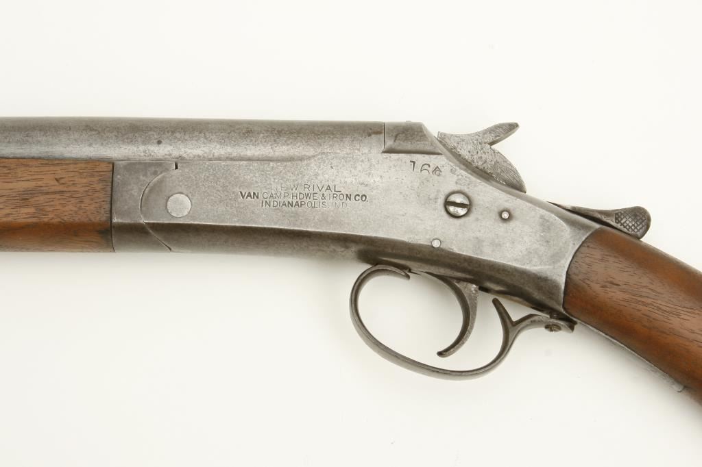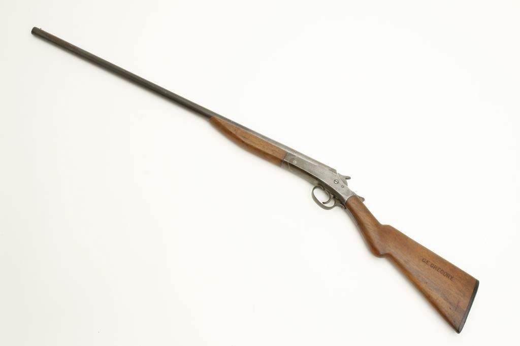 #428027. The shotgun is in good overall condition with a 29 ¾” barrel with a brass bead front sight. The barrel is marked “GENUINE ARMORY STEEL” and retains a significant amount of its blued finish with light to moderate surface rust noted. The receiver has primarily to a sliver patina and is marked, “VAN CAMP HDWE & IRON CO. INDIANAPOLIS, IN”. The smooth wood stocks are in good condition showing moderate use with small dents and compressions. The butt stock has had, “G.E. GREGORY” stamped into the right side and ends with a hard rubber butt plate and a 14” LOP. The bore is fair, the action functions and the markings are legible on this neat old single shot. (C+R) Est.: $100-$200.