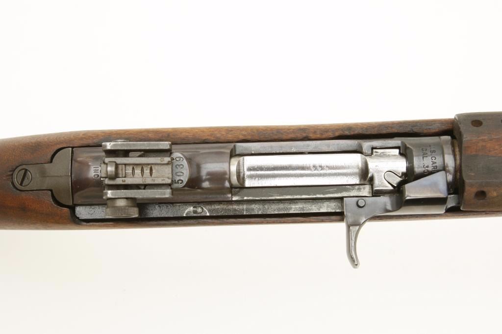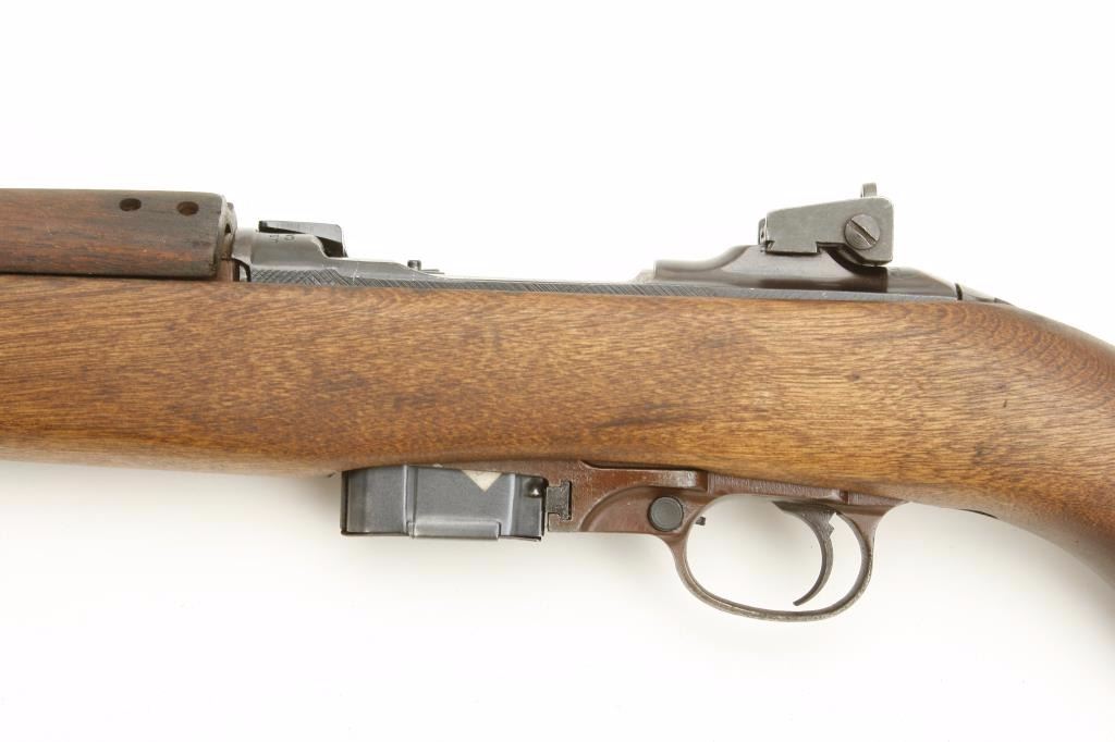 #5039. The carbine is assembled from G.I. parts with an 18ā barrel. The barrel retains the majority of its military finish with light surface rust and no import mark observed. The action retains the majority of its military finish with a chromed bolt added. The smooth wood stock is in good condition with small mars and handling marks only. The butt stock has a āPā proof behind the trigger guard and ends with a checkered metal butt plate. The bore is good, the action functions and the markings are legible. The lot includes one correct magazine. (C+R) Est.: $250-$500.