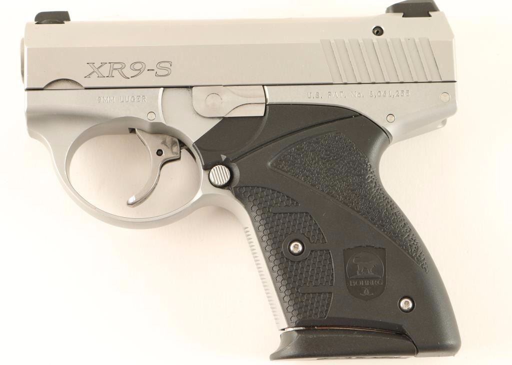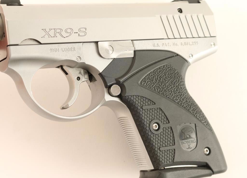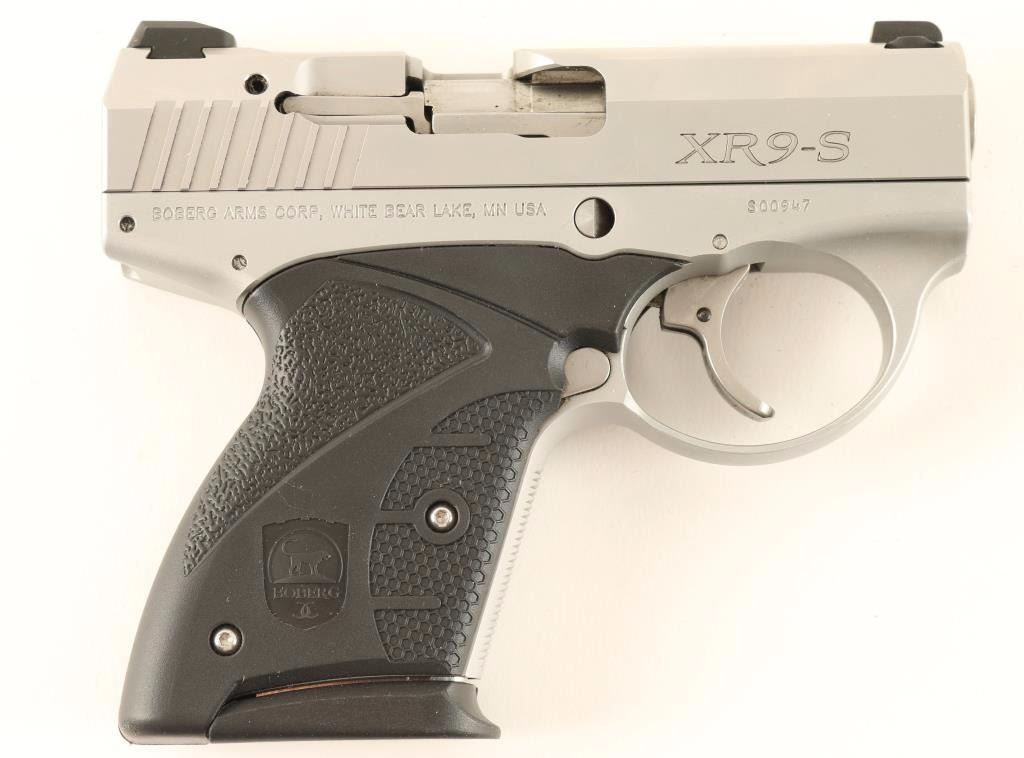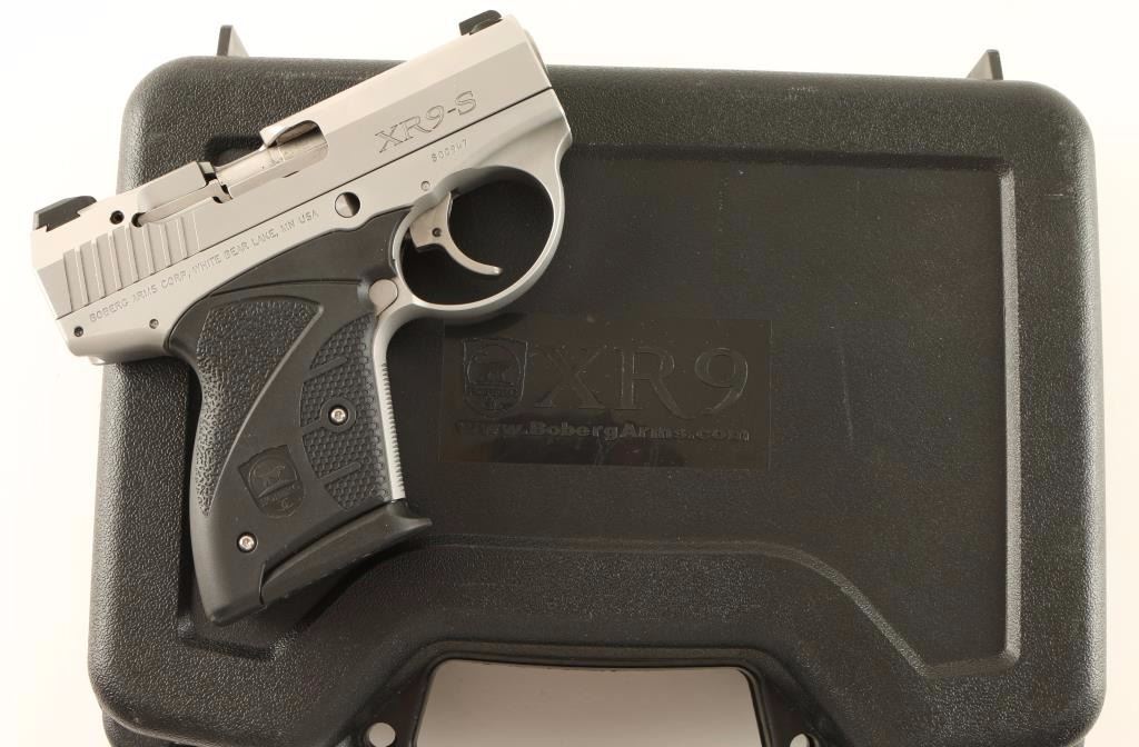 Subcompact striker-fired double action only semi automatic pistol chambered in 9mm Luger. Features a 3.35" rotating barrel, stainless steel slide, dovetailed low profile three dot night sights, aluminum frame, 7 round reverse feeding magazine, flat hammer, push button magazine release, smooth trigger and textured Boberg black plastic grips. Includes original factory hard case with documents and lock. Pistol exhibits only a few minor handling marks. Action is smooth, bore is pristine and grips are fine. Condition is excellent in case. ***Modern Firearm***