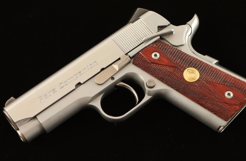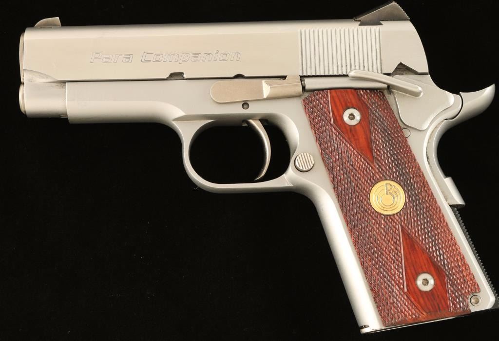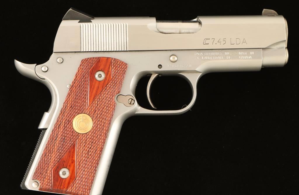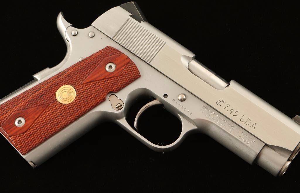 'Companion' Canadian made compact 1911 style semi-automatic pistol chambered in .45 Automatic Colt Pistol. Features a stainless steel slide, 3.5" barrel, low profile three dot sights, smooth LDA trigger, bobbed hammer, thumb safety, beavertail grip safety, 7 round factory magazine, checkered mainspring housing and two piece double diamond checkered medallion grips. Includes the original hard case with documents and tools. Pistol shows light wear from handling and carrying with fine scratches and scuffs. Action is smooth, bore is excellent and wood grips are fine. Condition is near excellent in case. ***Modern Firearm***
