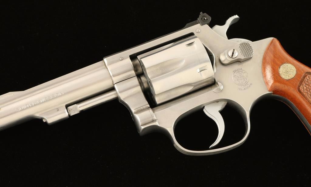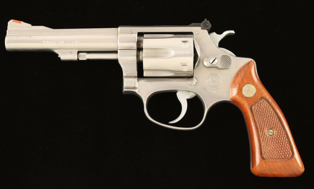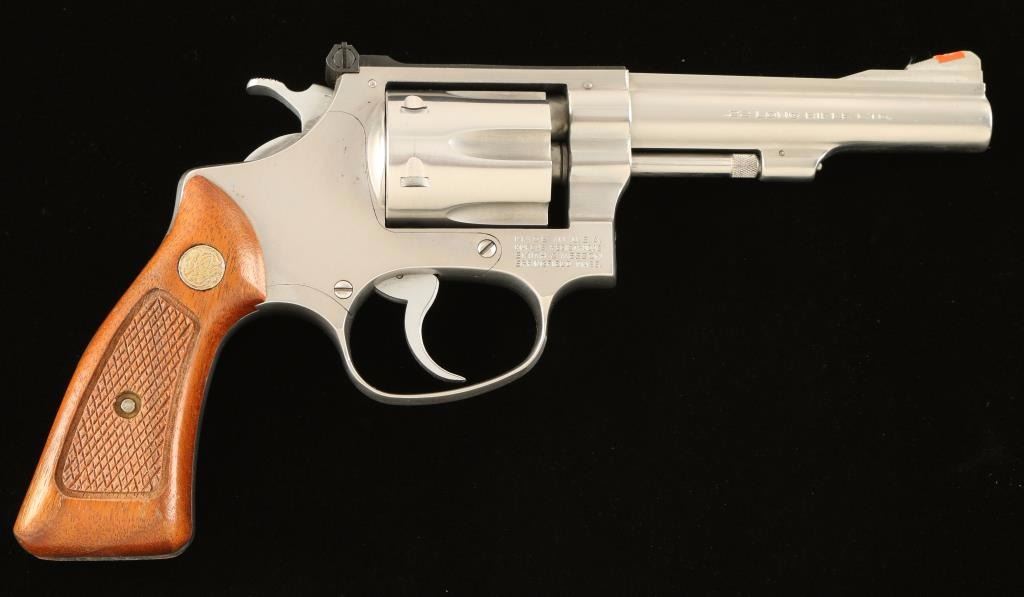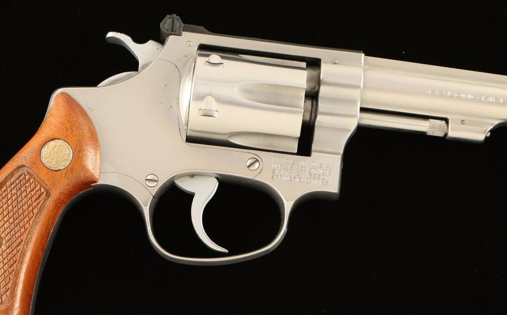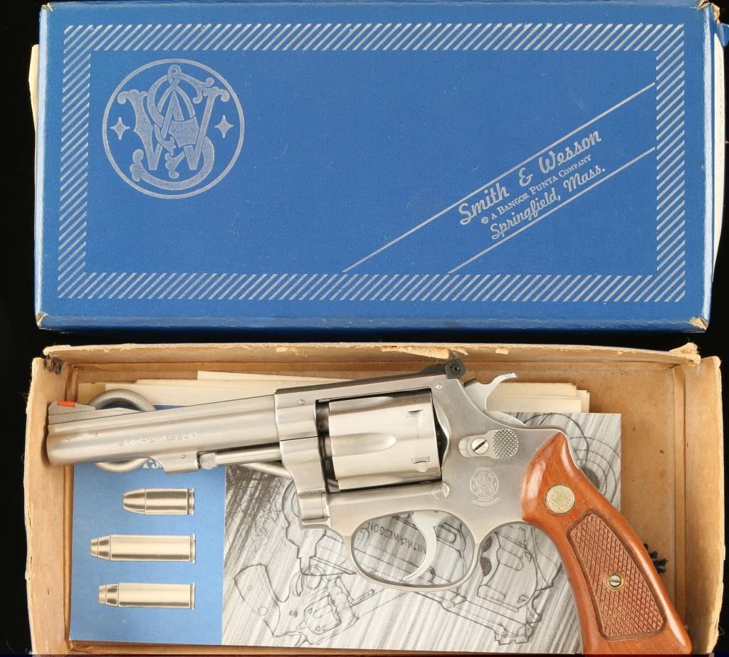 Stainless steel double action revolver chambered in .22 Long Rifle. Features a brushed finish, pinned 4" barrel with serrated rib, ramped front sight with red insert, adjustable micrometer click rear sight, serrated trigger, checkered hammer spur, fluted six shot cylinder and checkered medallion S&W Magna grips. Includes original box, papers, and cleaning equipment. Revolver shows light handling wear with numerous superficial scratches but no major wear. Action is crisp, lock-up is tight, bore is excellent and wood grips are fine. Would clean up beautifully. Condition is very good+ in box. ***Modern Firearm***