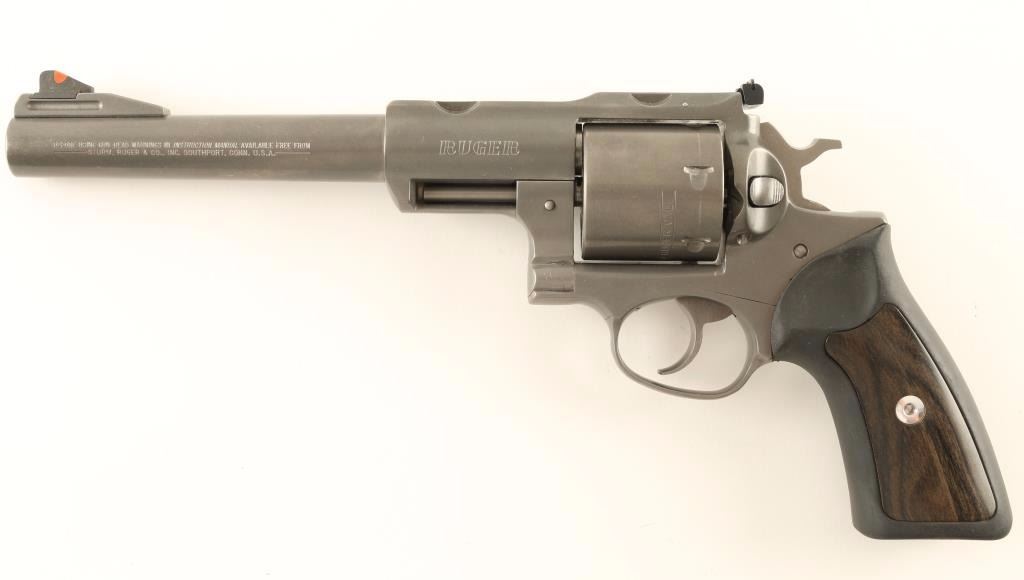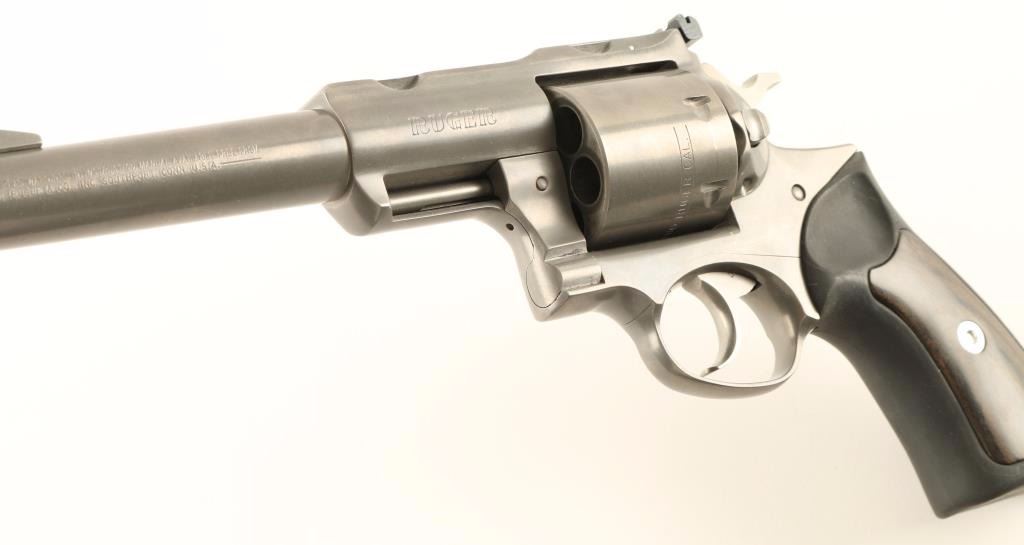 Large frame stainless steel double action revolver chambered in .480 Ruger. Features a Target Grey finish, 7.5" barrel, ramped blade front sight, adjustable rear window sight, flat top frame cut for rings, non-fluted six shot cylinder, checkered hammer spur, smooth trigger, and two piece grips constructed of black rubber and Goncalo Alves. Includes original factory hard case with rings, tool, lock and documents. Revolver shows very little use with only light handling marks and a drag line. Action is smooth, bore is pristine and grips are fine. Condition is excellent in box. ***Modern Firearm***