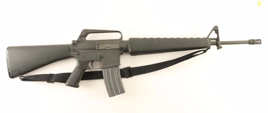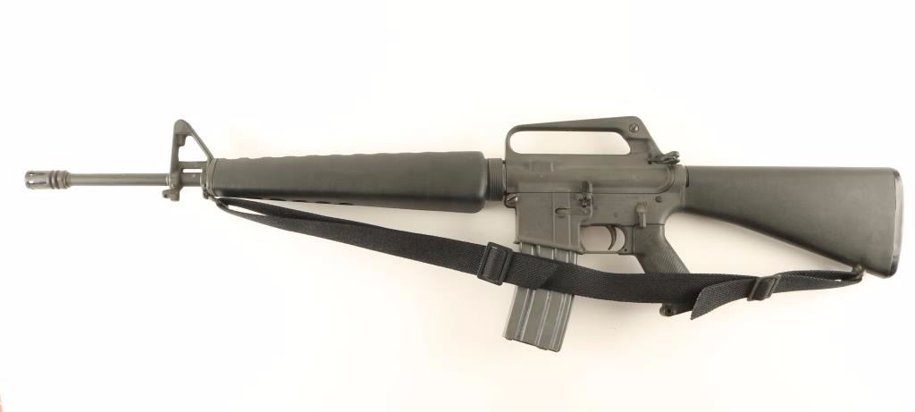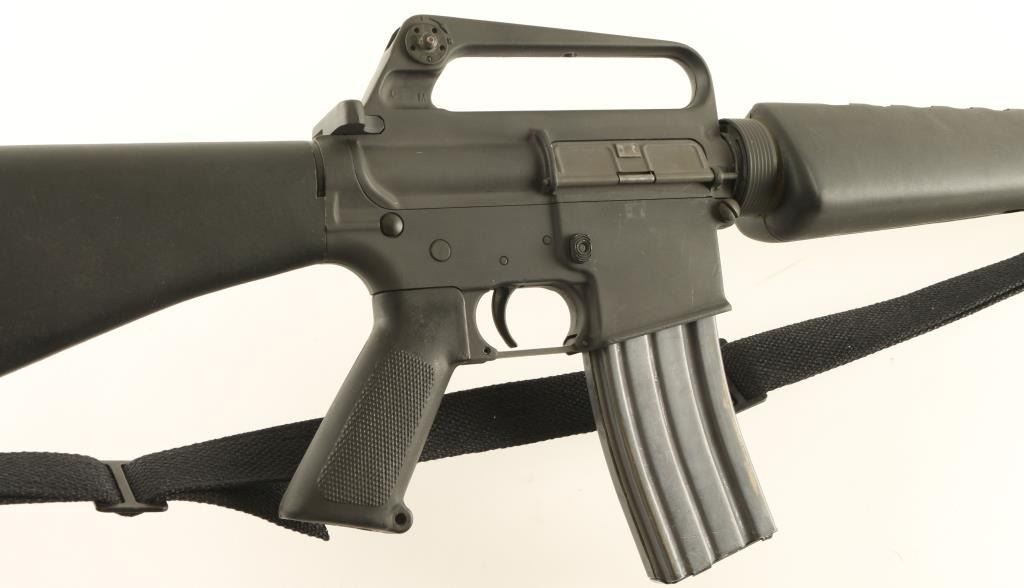 Gas-operated semi automatic sporting rifle chambered in .223 Remington, circa 1982. Features a 20" chrome-bore barrel with bird cage style flash hider, adjustable A2 winged front sight with bayonet lug, dual aperture rear sight in carrying handle, triangular hand guard, correct BCG, checkered black plastic pistol grip, 30 round magazine, safety selector, black nylon sling, and black composite shoulder stock with trapdoor buttplate. Finish shows light wear and some scuffs from handling & storage. Markings are crisp and there are some small dings in the metal under the finish around the magazine well's outer edge. Action is sound, bore is excellent, and stocks are fine. Condition is near excellent. ***Modern Firearm***