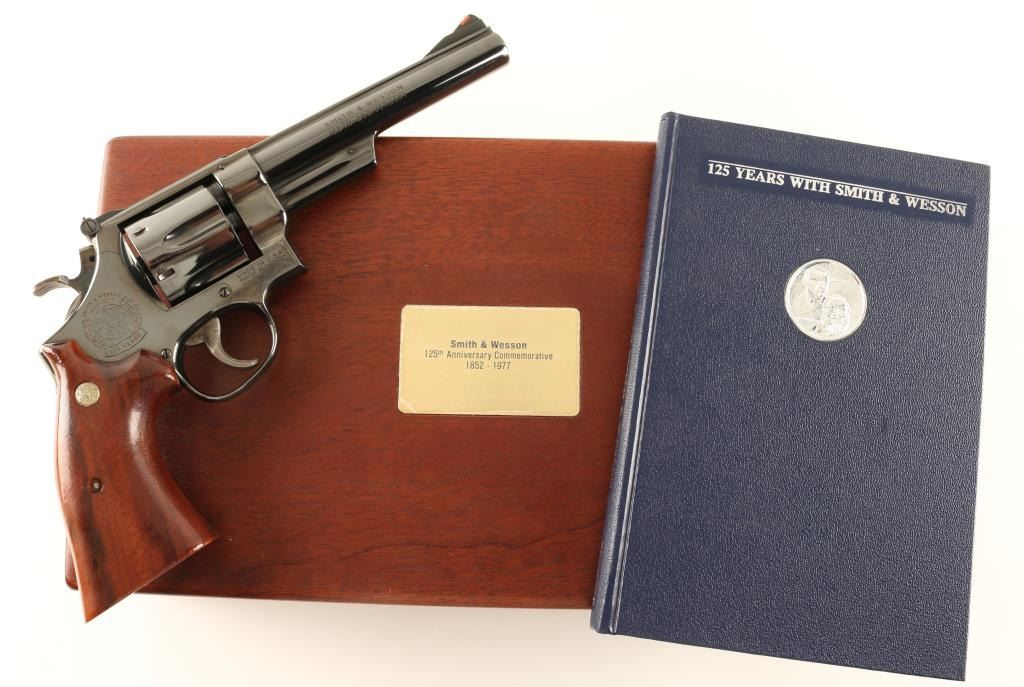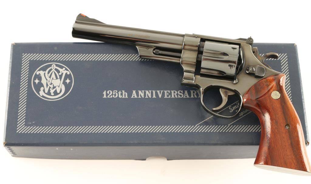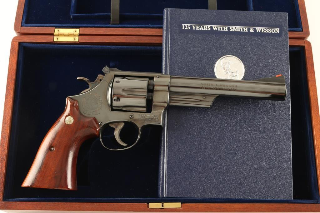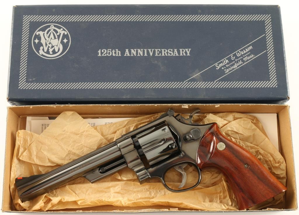 '125th Anniversary' Commemorative double action revolver chambered in .45 Colt. Features a blued finish, 6 3/8" pinned barrel with solid rib, ramped front sight with red insert, adjustable micrometer click rear sight, case hardened target trigger & hammer, fluted six shot cylinder, and two piece smooth goncalo alves medallion target grips. Includes the original factory box with documents and a mahogany velvet lined display case with brass plaque & book. Revolver retains 98% of it's blued finish with minimal handling wear. Action is smooth, bore is excellent and grips are fine. Condition is excellent. ***C&R Firearm*** ***Modern Firearm***