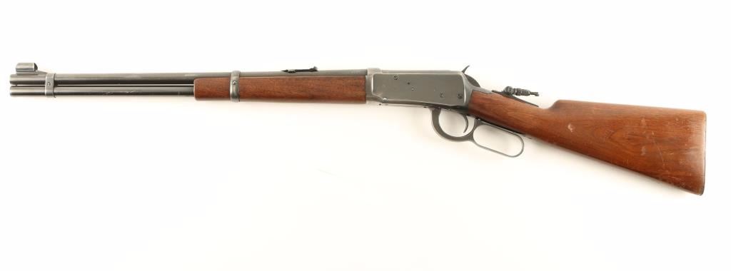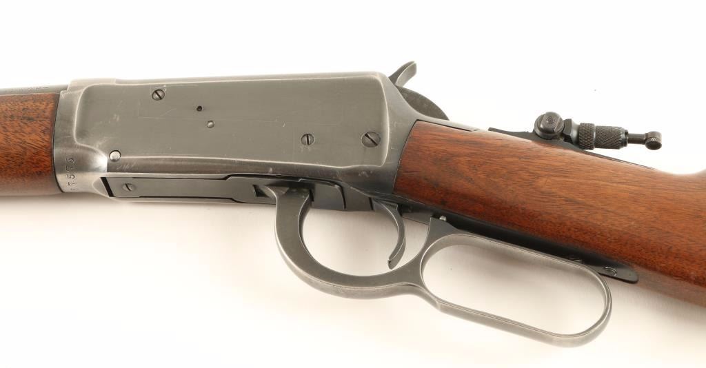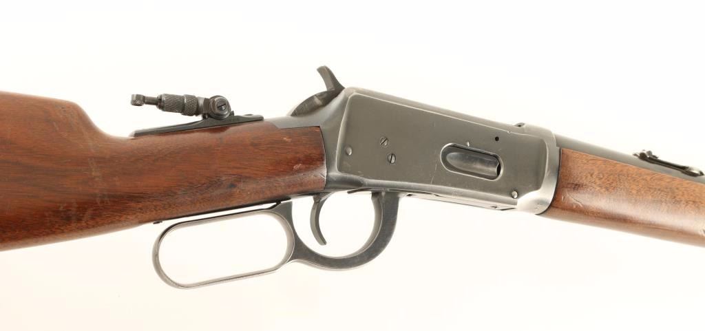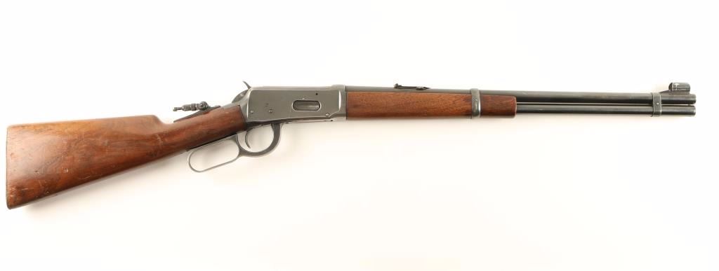 'Flat Band' Pre-64 lever action repeating rifle chambered in .30-30 Winchester, circa 1948. Features a blued finish, 20" barrel, ramped & hooded blade front sight, folding leaf rear sight, Marbles peep sight, flat sided front barrel band, smooth trigger, full magazine tube, serrated hammer spur, smooth walnut forend and straight grip shoulder stock with metal shotgun buttplate. Rifle retains approximately 70% of its original finish, showing edge wear and handling marks. Action is smooth, bore is excellent, and wood stocks are good with a few nicks, filled swivel stud hole & a crack at the toe. Condition is very good. ***C&R Firearm*** ***Modern Firearm***
