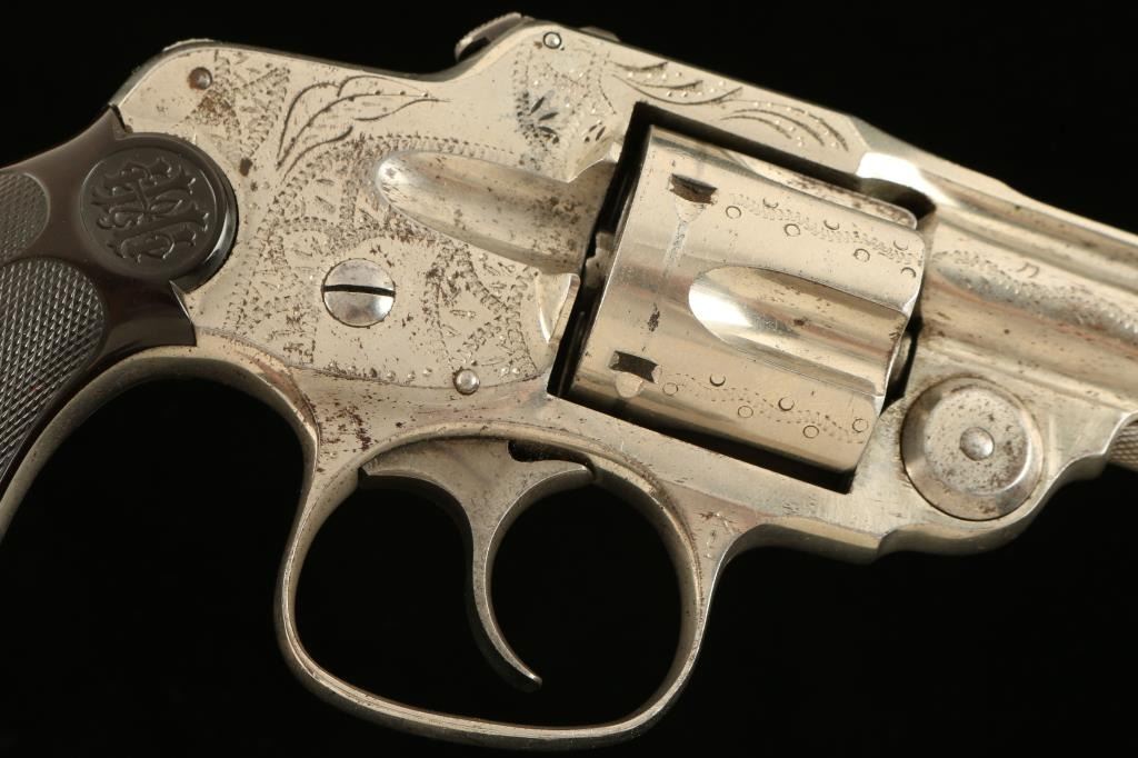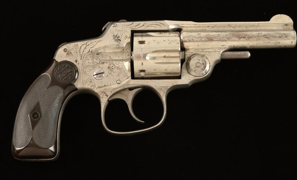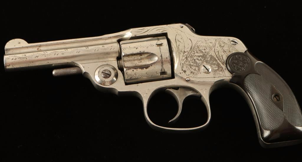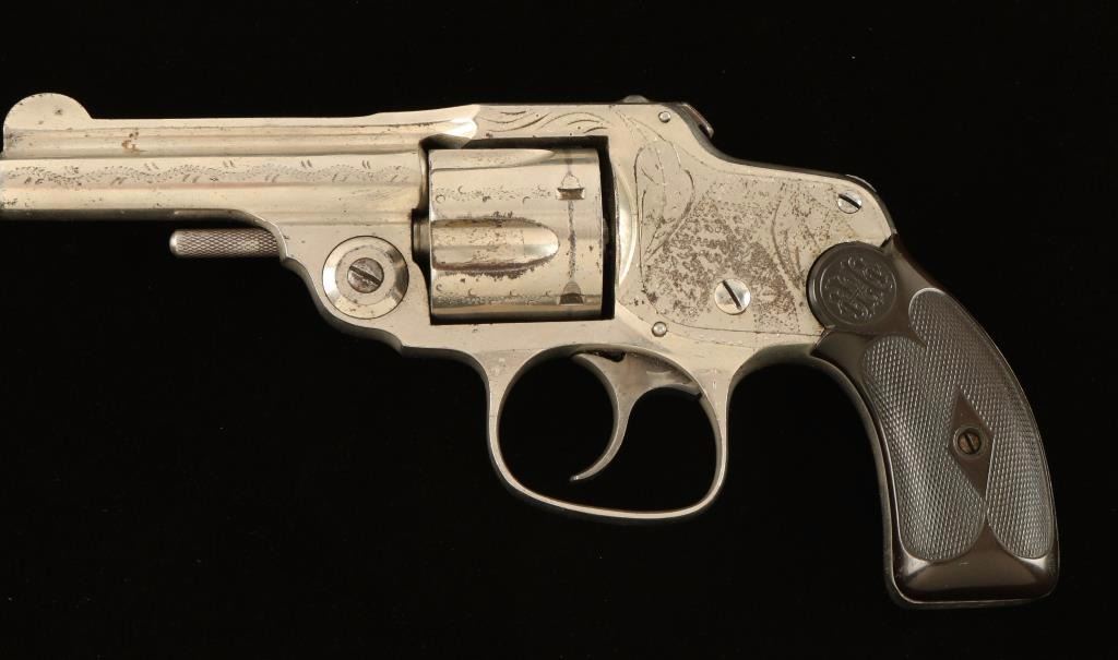 SN: 12480 Interesting and scarce double action revolver chambered in .32 centerfire, circa 1880's-1890's. Features a nickel plated finish, light engraving, 3.2" barrel, five-shot fluted cylinder, smooth crescent trigger, concealed hammer, fixed sights, rotating safety switch, and two-piece checkered hard rubber grips. Finish shows approximately 85% original nickel plating intact with a small area of surface rust on the left side of the barrel rib near the muzzle. Action & safety function well, bore is good, and grips fine. Condition is very good. ***Antique Firearm***