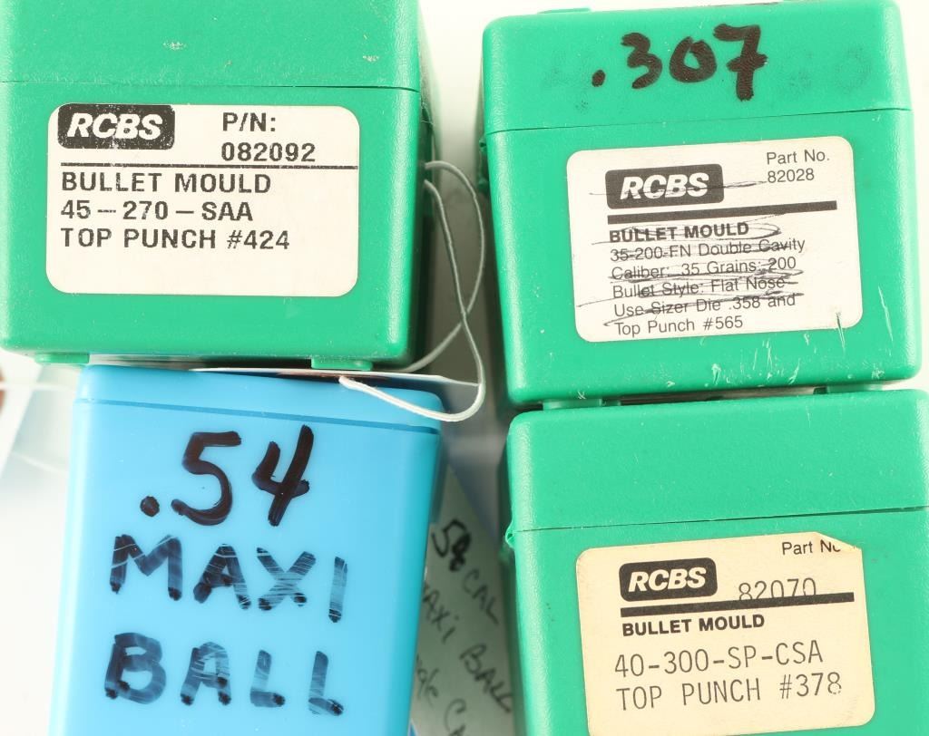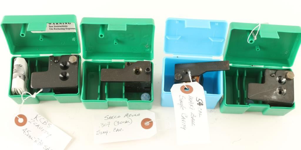 Includes a Saeco .307 (.30 cal) single cavity mold, a RCBS .45 - 270 SAA 2 cavity mold, a RCBS .40-300-SP-CSA 2 cavity mold, and a Maxi ball .54 cal single cavity mold. No handles included with molds