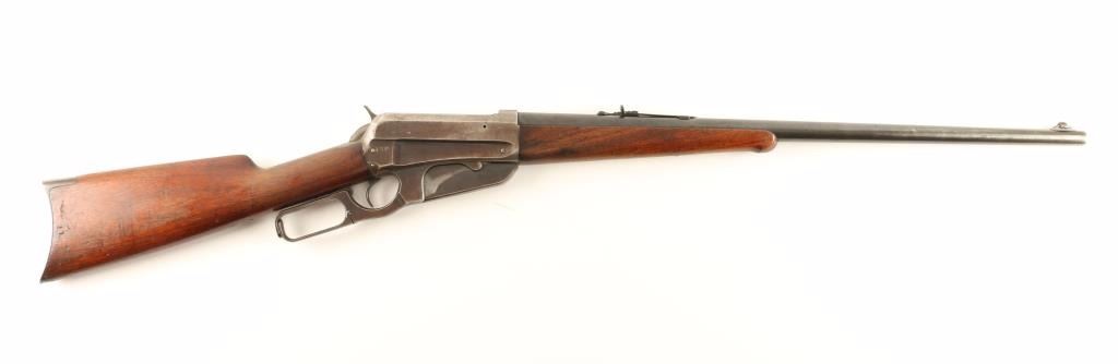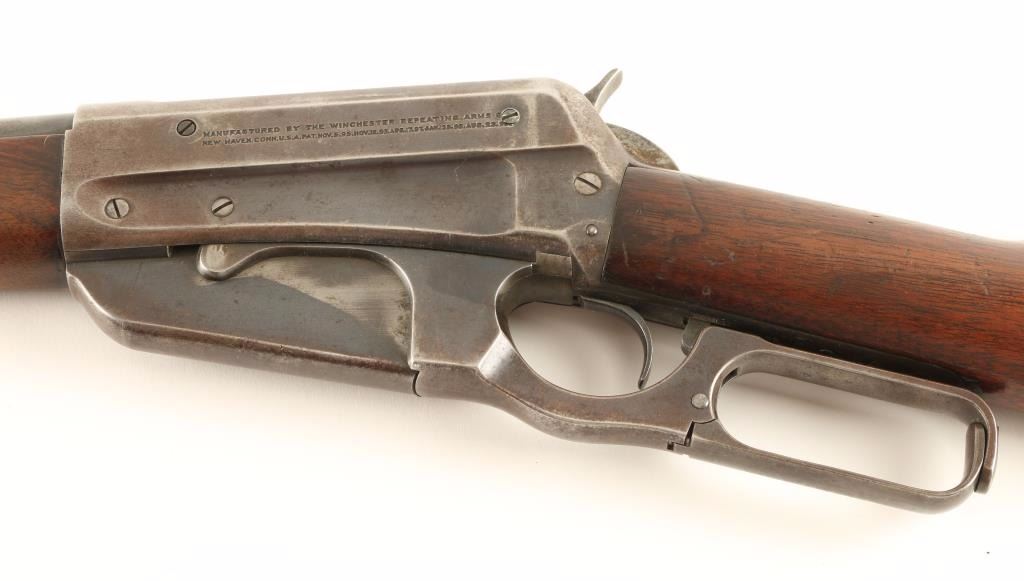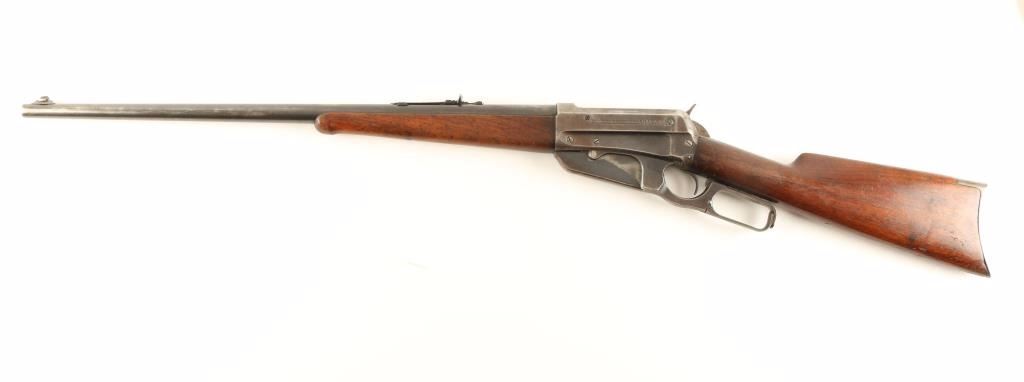 Magazine-fed lever action repeating rifle chambered in .35 Winchester, circa 1905. Features a 23 7/8" tapered barrel, blade front sight, adjustable semi-buckhorn rear sight, non-detachable box magazine, smooth trigger, checkered hammer spur, schnabel walnut forend with ebony insert and straight grip shoulder stock with crescent metal buttplate. Rifle exhibits approximately 60% of it's original blued finish showing honest wear. The rifle also has a few small spots of dark rust scattered over the barrel, lever & magazine. Action is smooth, bore is excellent and wood stocks are near fine. Condition is very good+ as vintage. ***C&R Firearm*** ***Modern Firearm***