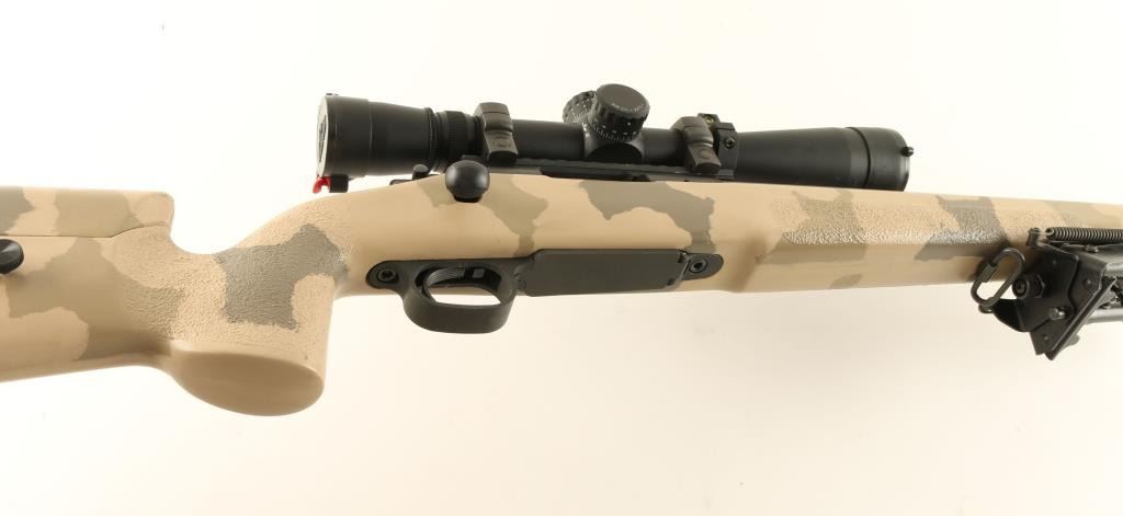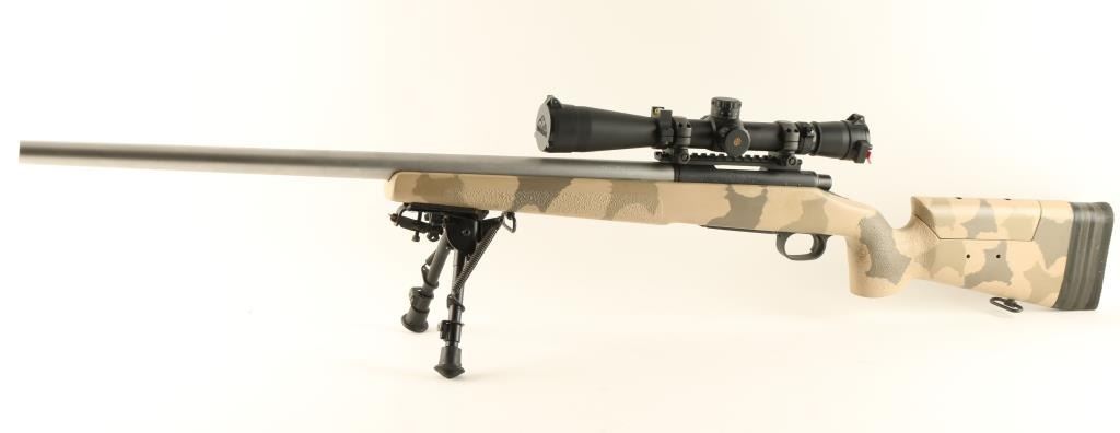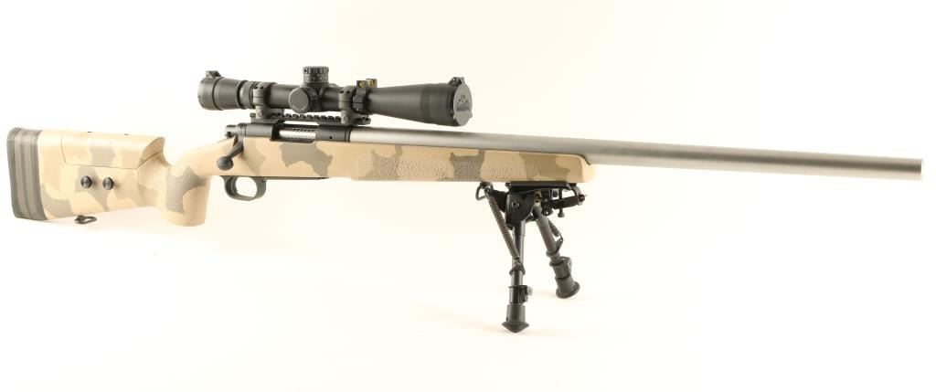 Fully customized bolt action rifle built for long range precision shooting and chambered in .308 Winchester .345 Neck Diameter. Features a heavy 26" glass bead finished stainless steel barrel with recessed crown marked Hammond Rifles, black parkerized Remington 700 receiver, Leupold Vari-X III Long Range 3.5-10x scope on Badger Ordnance base, internal magazine with hinged floorplate, manual safety, jewelled bolt with bent checkered bolt handle, Harris HBRM bi-pod and McMillan A-3 fiberglass tactical camouflage stock with adjustable cheek piece. Rifle exhibits some minor scuffs to the matte finished barrel with no major wear. Action is very smooth, bore is pristine and stock is fine. Condition is excellent. ***Modern Firearm***