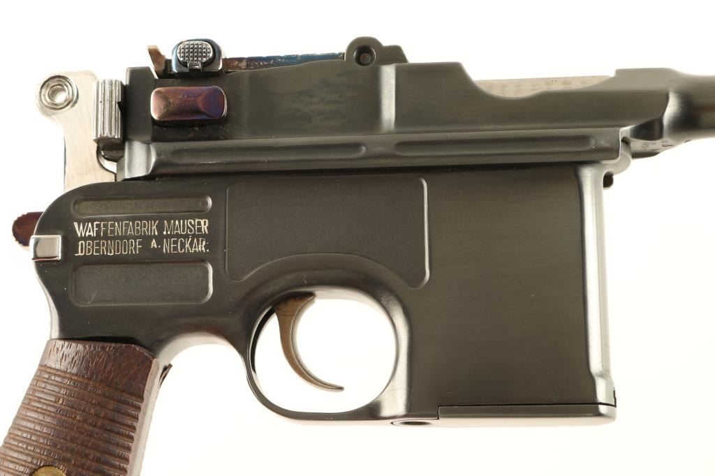 Refinished early post war production semi-automatic pistol chambered in 7.63x25mm. Features a fine blued refinish, 3.9" barrel, blade front sight, graduated rear sight to 1,000 meters, jewelled bolt, straw blued smooth trigger, internal 10 round magazine, stripper clip guide, serrated hammer spur with small diameter hole and two piece 22-groove walnut grips. Serial numbers match on frame and lock mechanism frame only. Includes a locking canvas wrapped carrying case with leather corners, velvet lined compartmentalized interior, wood cartridge bock and four stripper clips. Finish remains approximately 98% intact showing very little wear. Action is strong, bore is excellent and good grips are near fine. Condition is excellent as refinished ***C&R Firearm*** ***Modern Firearm***