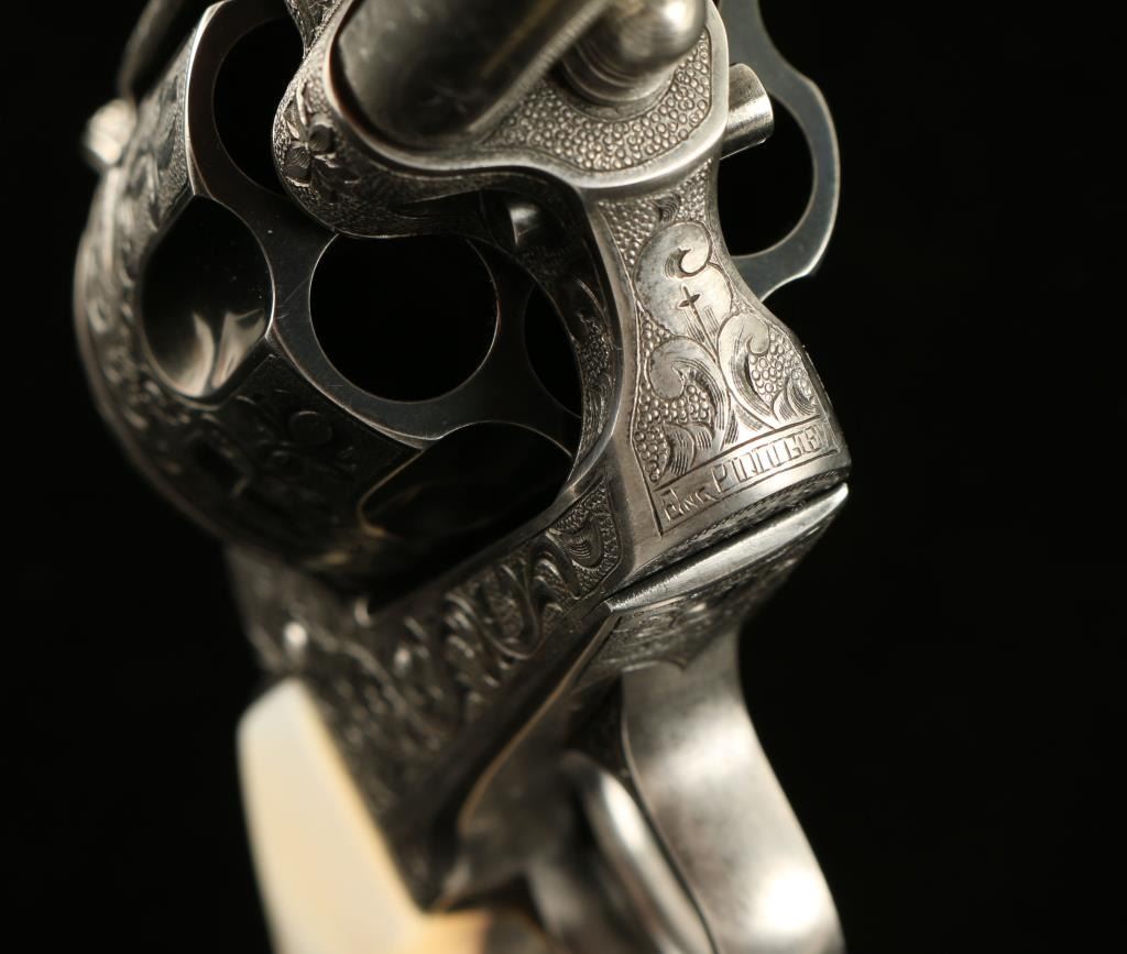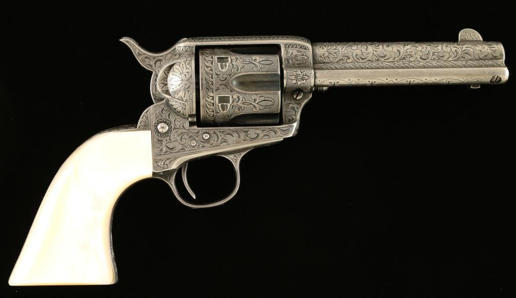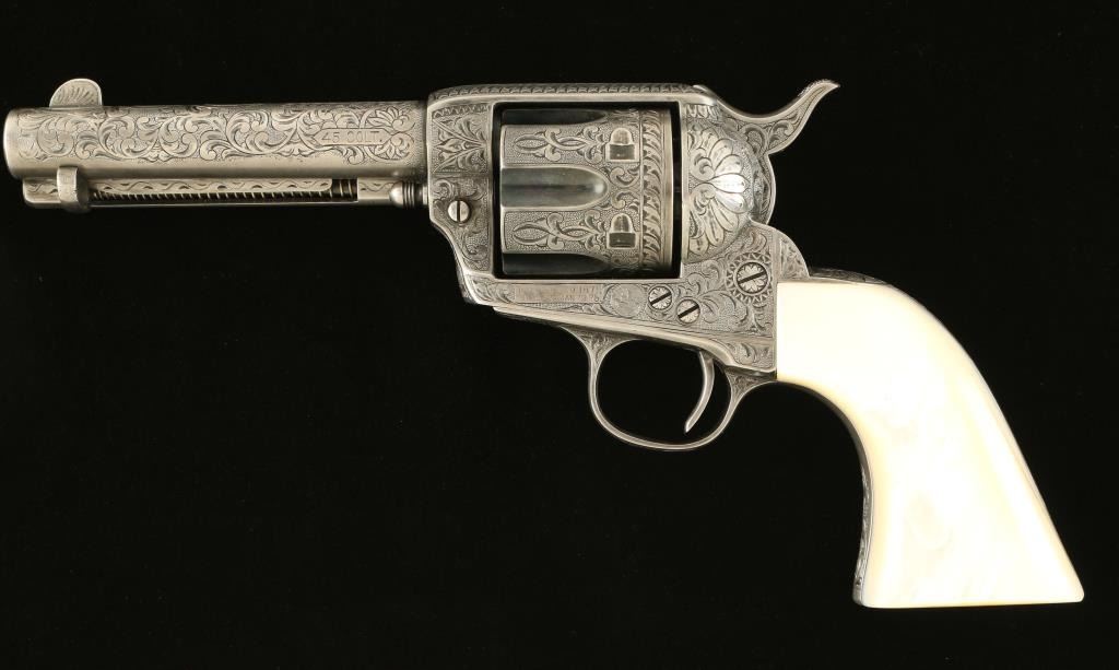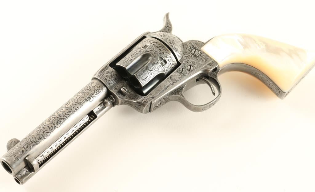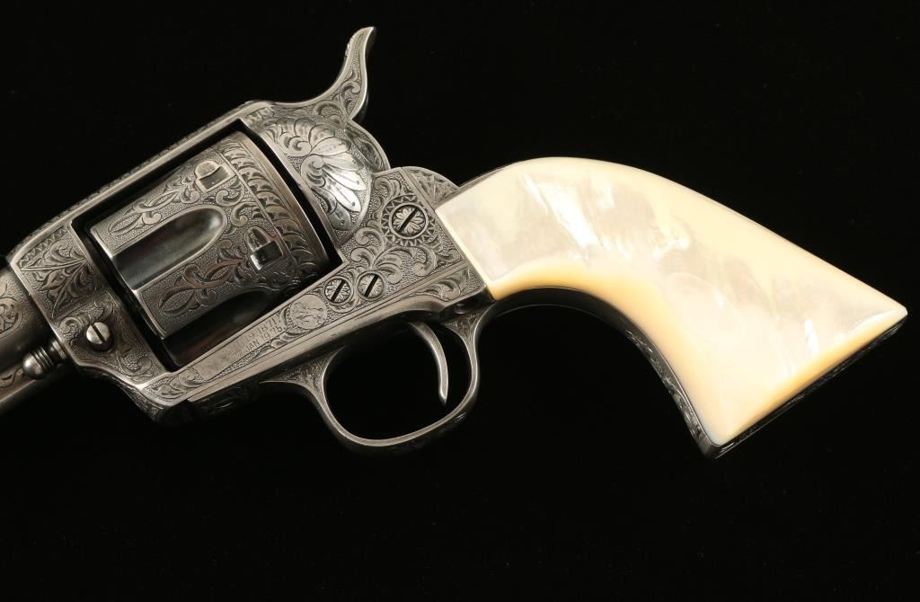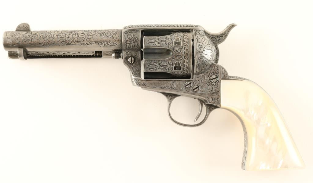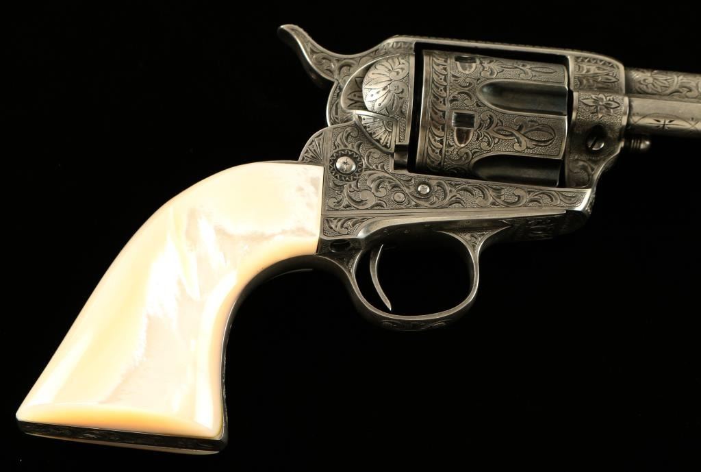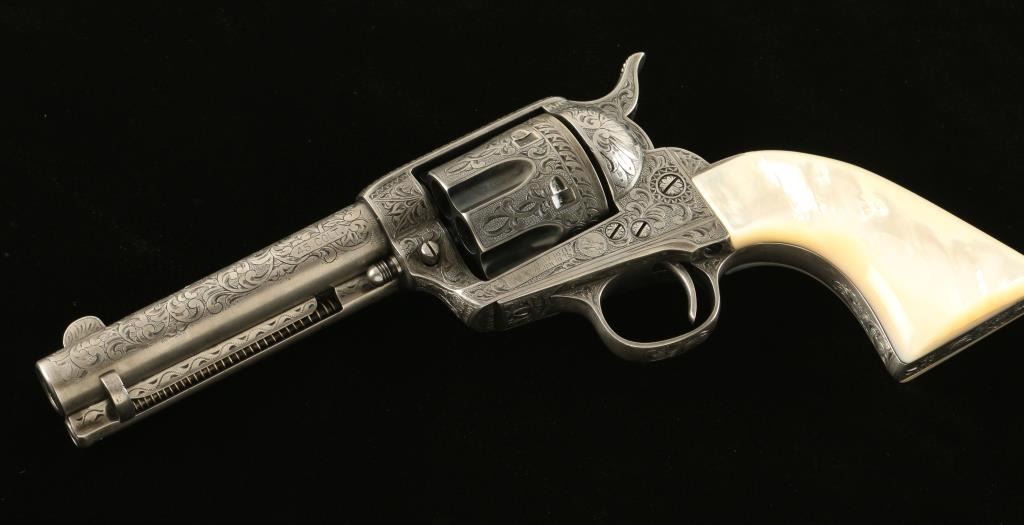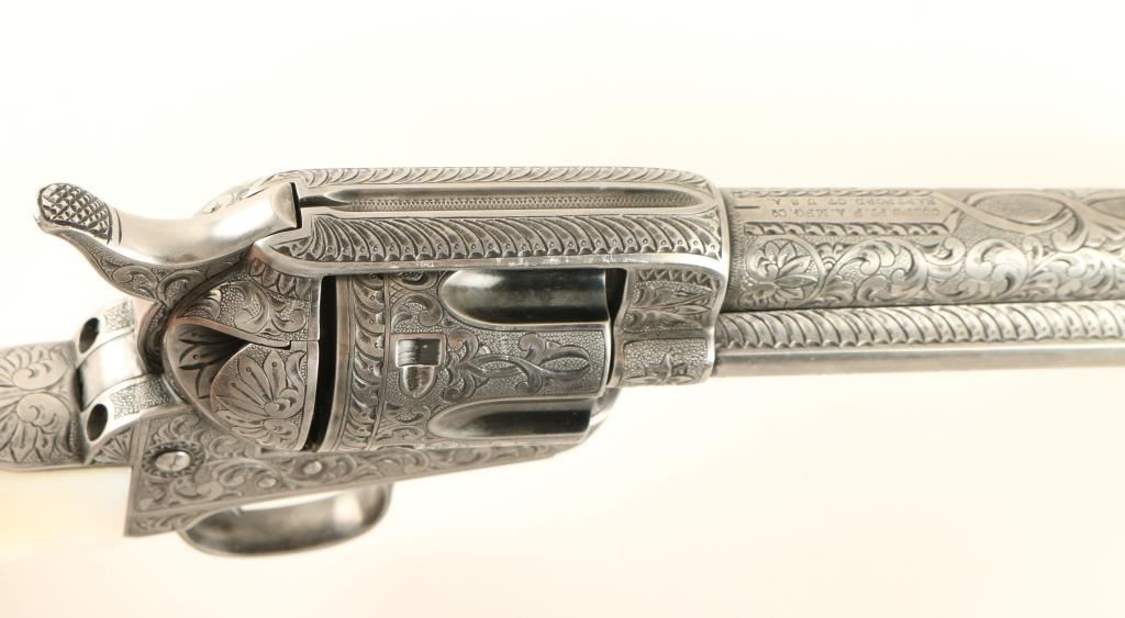 Beautifully engraved first generation single action revolver chambered in .45 Colt, circa 1904. Fully & finely engraved in an elegant floral motif by Tucson, Arizona master engraver Phillip Quigley, signed on frame. Features a blued finish, 4 3/4" barrel with two line address, blade front sight, 'v' notched rear sight, ejector rod, fluted six shot cylinder, checkered hammer spur, and gorgeous one-piece mother of pear grips. All matching numbers & includes a Colt Titanium three blade folder with box. Finish is mostly worn but remains evident within the engraving giving the revolver a beautiful antique finish. Action is smooth, bore is excellent and mother of pear grip is fine with some cracks but no losses. Condition is fine. ***C&R Firearm*** ***Modern Firearm***