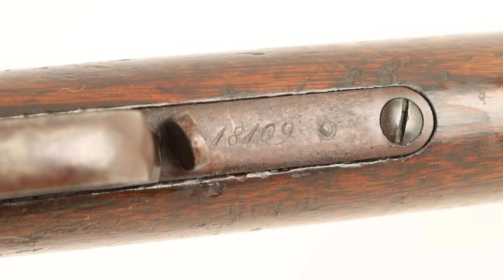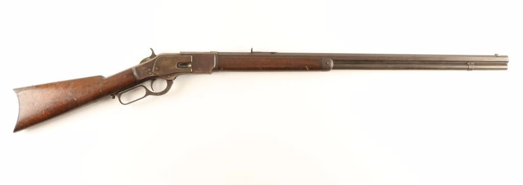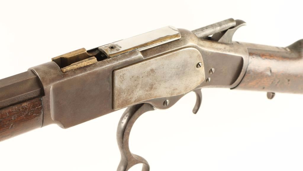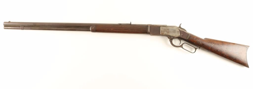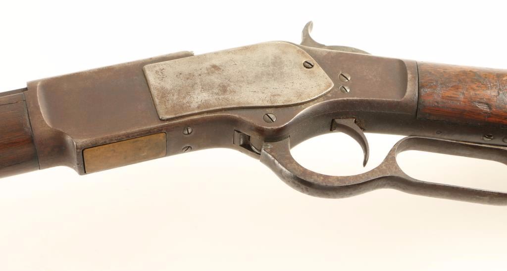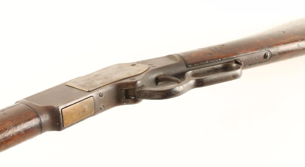 'First Model' Early third year production lever action repeating rifle chambered in .44-40 Winchester, circa 1876. Features a 28" King's Improvement octagonal barrel, full tube magazine, blade front sight, semi-buckhorn rear sight(missing ramp), single set trigger, replacement dust cover, checkered hammer spur, smooth walnut forend with metal cap and straight grip shoulder stock with crescent trapdoor buttplate. Rifle bares a dark brown patina and shows pitting on top of the frame near the breech and scattered dark oxidation. Action is smooth, bore is dark and may have a ring 4-6" from the muzzle and forend shows a 2.5" crack but otherwise stocks are in good condition. Condition is good+. ***Antique Firearm***