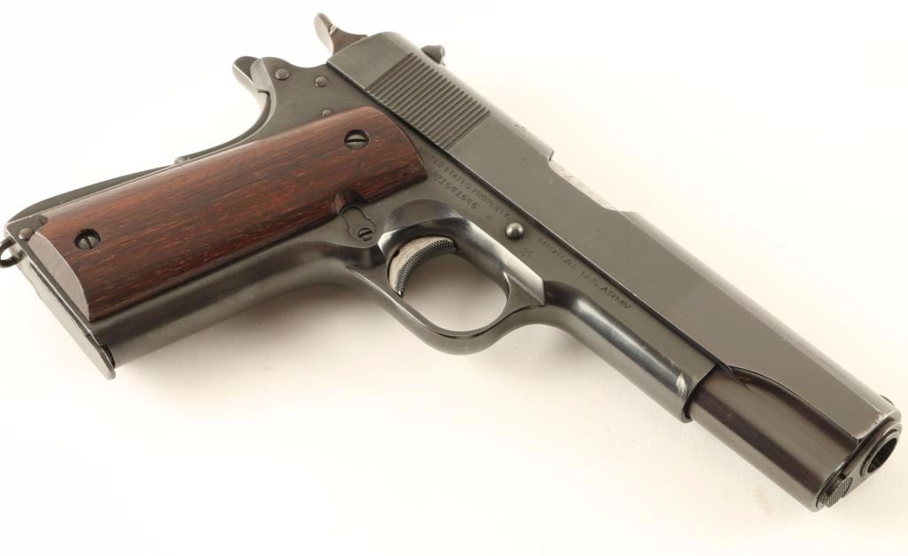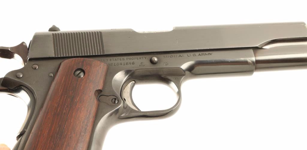 U.S. Military contracted semi-automatic service pistol chambered in .45 Automatic Colt Pistol, circa 1944. This pistol was apart of the Lend-Lease Act and bares British proofs. It also features, a fine blued refinish , 5" jeweled barrel, serrated front sight, wide square notched rear sight, stamped trigger, wide spur hammer spur, thumb safety, beavertail grip safety, unmarked 7 round two-tone magazine, checkered slide stop, serrated mainspring housing, and two piece smooth wood grips. US markings on frame - "United States Property/No1641646", "M1911A1 U.S. Army", "G.H.D.", 'Crossed Cannons', "P". Pistol retains approximately 94% of it's refinish with light scattered oxidation on the slide and a small amount of very light surface rust emerging on the right side of the frame near the lanyard loop. Action is strong, bore is excellent, and wood grips are fine. Condition is excellent. ***C&R Firearm*** ***Modern Firearm***