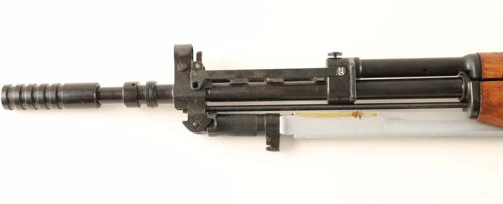 'Mdl 59/66' Yugoslavian made gas-operated semi automatic rifle chambered in 7.62x39mm. Features a blued finish, 20.5" barrel with grenade launcher, hooded post front sight, adjustable tangent rear sight, grenade launcher sight, flip up night sights, cleaning rod, folding blade bayonet, safety selector, two sling points, fixed 10 round magazine, smooth wood handguard and pistol grip shoulder stock with recoil pad. Matching serial numbers on receiver, cover, bolt carrier, triggerguard, magazine and stock. Import marks on barrel. Rifle retains approximately 98% of it's blued finish showing little wear. Action is sluggish(lots of cosmoline), bore is excellent and wood stock is very good+. Condition is excellent. ***Modern Firearm***
