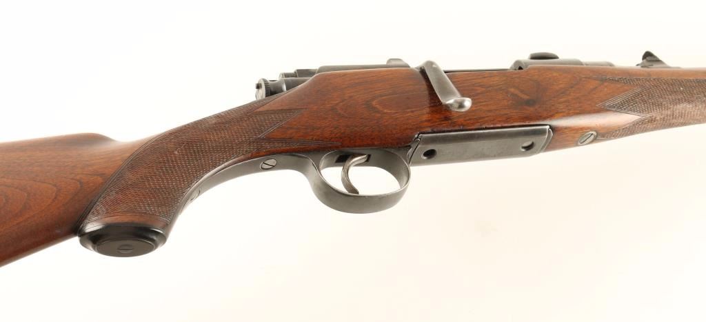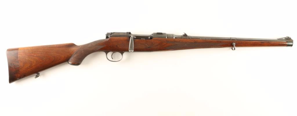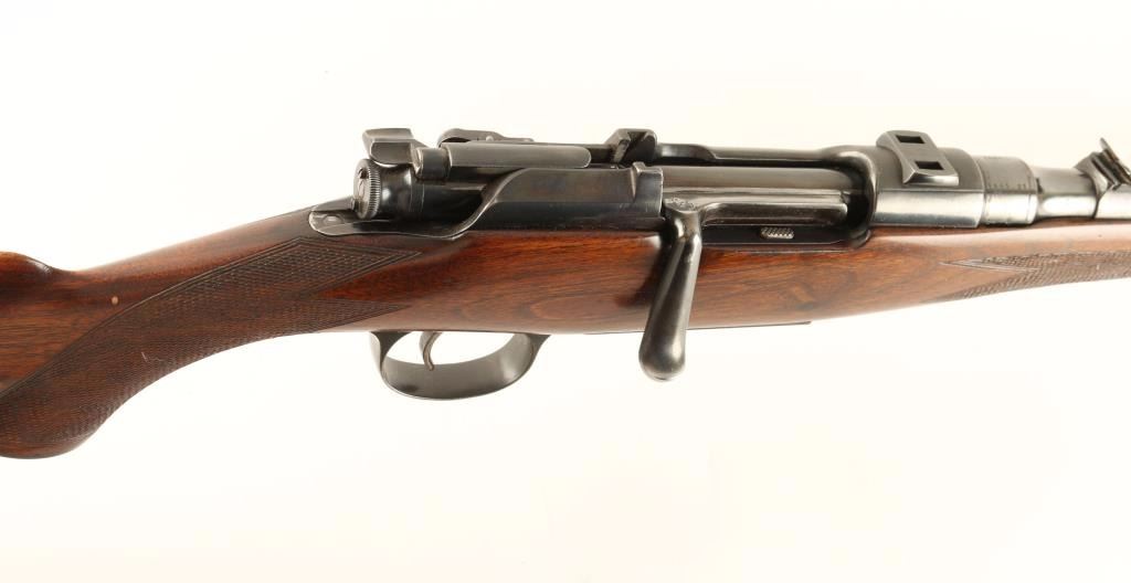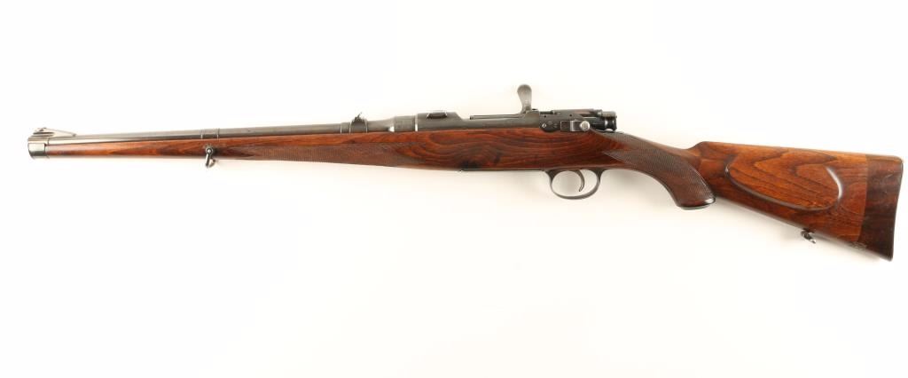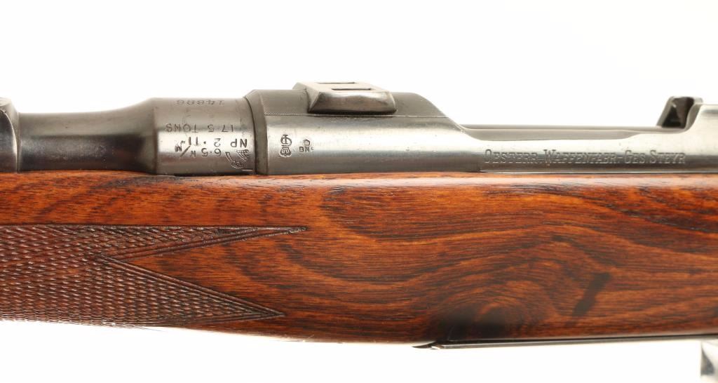 Exquisite Austrian made bolt action sporting rifle chambered in 6.5x54mm Mannlicher-Schoenaur. Features a blued finish, 17.7" barrel, ramped blade front sight, folding leaf rear sight, dovetailed claw mount scope base, drilled & tapped receiver for rear scope mount, spoon style bolt handle, safety switch on bolt, drilled & tapped cocking piece for peep sight, single trigger, sling swivels, removable rotary magazine, and hand checkered full walnut pistol grip shoulder stock with metal forend cap & cheek rest. Serial numbers match on barrel, receiver & bolt. Rifle exhibits approximately 65% of it's original finish with the barrel turning to a pleasant brown patina and showing a few examples of dark oxidation. Action is crisp, bore is excellent, and walnut stock is near fine baring an old repair or extension using a darker wood. Condition is very good++. ***Modern Firearm***