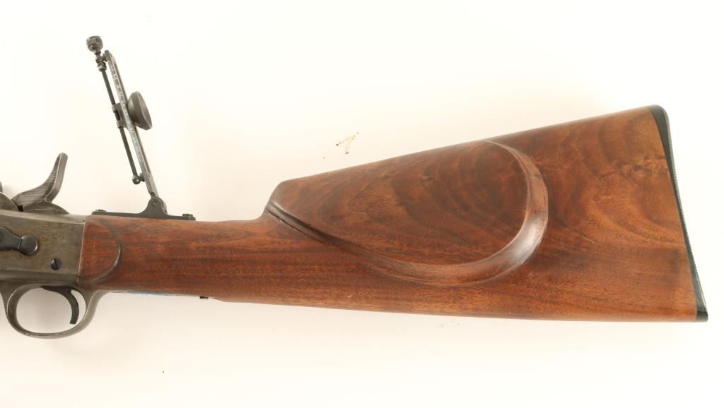 Customized single shot rolling block rifle chambered in 7x57mm, built off an 1868-1888 vintage receiver. Features a blued 30" military style barrel, blade front sight, mid-range tang sight, smooth trigger, checkered hammer spur, smooth Schnabel walnut forend and straight grip shoulder stock with cheek rest & Bishop buttplate. Barrel retains approximately 88% of it's blued finish with scattered light pitting & fine scratches. Receiver has moved to a nice grey/brown patina and shows some light pitting on the trigger guard. Action is solid, bore is dull with good rifling and custom wood stocks are fine. Condition is good+. ***Antique Firearm***