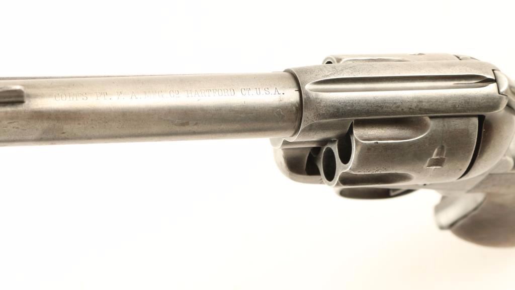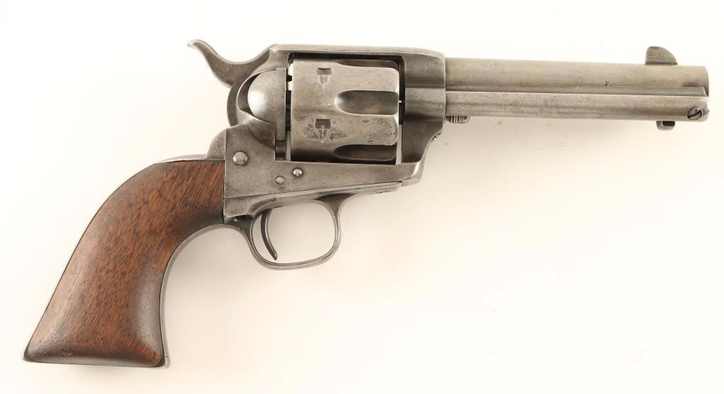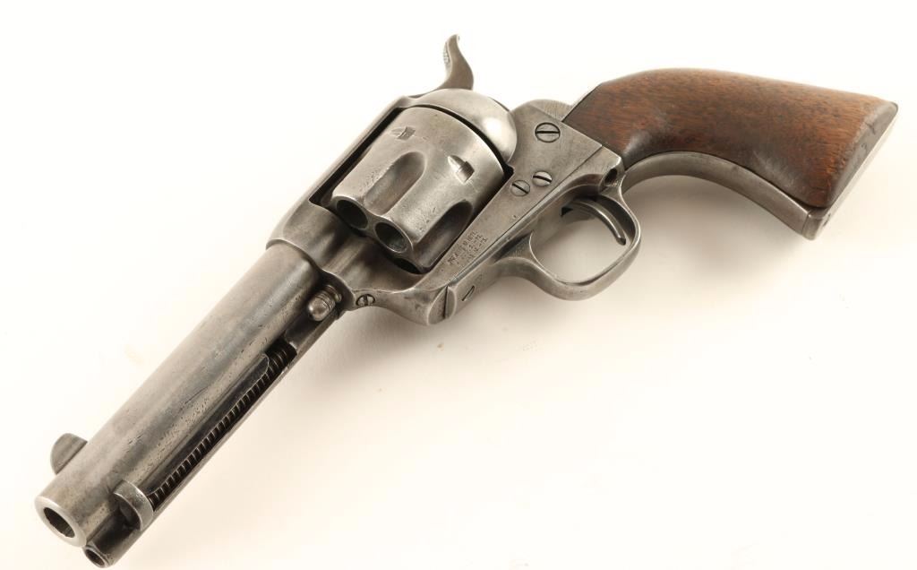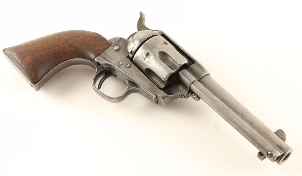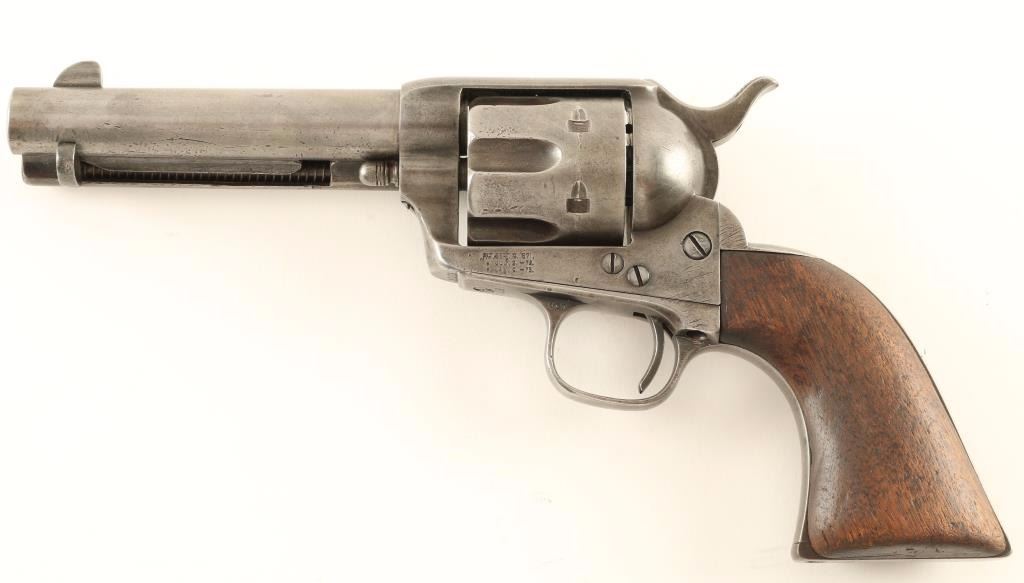 First generation black powder Colt Single Action Army chambered in .44-40, circa 1880. Features a blued finish, 4 3/4" barrel with one line address, blade front sight, v-notched rear sight, ejector rod, fluted six shot cylinder, three line patent markings, ".44 CF" stamped on trigger guard, checkered hammer spur, and one piece smooth walnut grip. Matching serial numbers on frame, trigger guard, and backstrap. The barrel has no visible caliber marking on the left side of the barrel but has a small '44' stamped into it's underside. Revolver bares an even mid-grey patina with some finish retained in protected areas. Action is sound, bore is good and wood grip is well worn with rounded corners. Condition is very good. ***Antique Firearm***