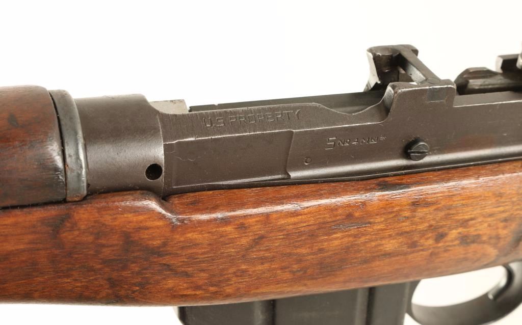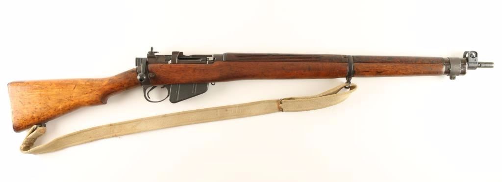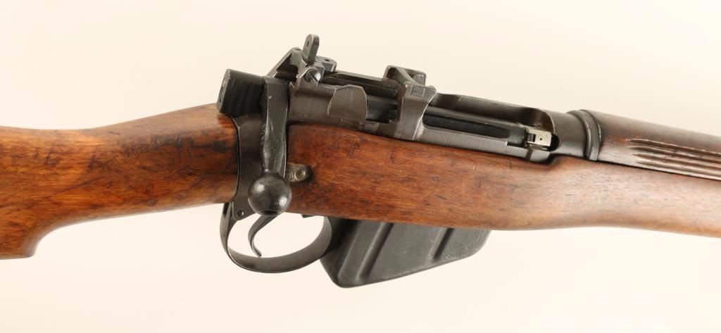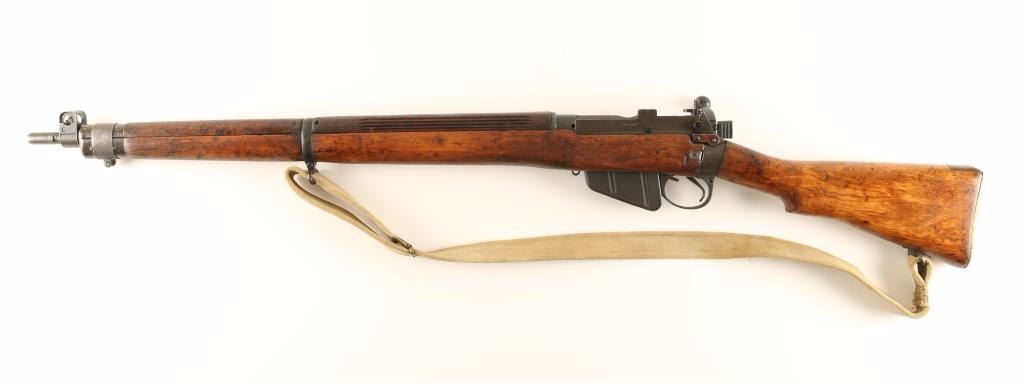 U.S. Property marked Lee Enfield bolt action service rifle chambered in .303 British. Features a blued finish, 25.2" barrel, ramped & winged blade front sight, dual aperture rear sight, stripper clip guide, 10 round detachable magazine, canvas sling, and smooth wood full length stocks. Import marks on barrel. Rifle has a nice even brown/grey patina with surface rust beginning to form on the triggerguard. Action is smooth, two land bore is good and stocks are very good. Condition is good++. ***C&R Firearm*** ***Modern Firearm***