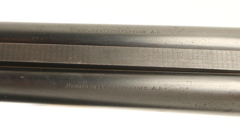 Swedish made double barrel side by side underlever shotgun chambered for 2.5" 12 gauge shells. Features blued 27.5" barrels with solid rib, case hardened receiver, sidelock action, extractor, exposed hammers, sling swivels, double triggers, and smooth pistol grip wood shoulder stock with metal buttplate. Barrels retain approximately 93% of their blued finish with some light scattered dark oxidation. Case hardened receiver show fading colors also with scattered dark oxidation. Action functions well, bores are excellent and wood stock is very good with a few small dings & scrapes. Condition is very good. ***Modern Firearm***