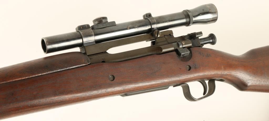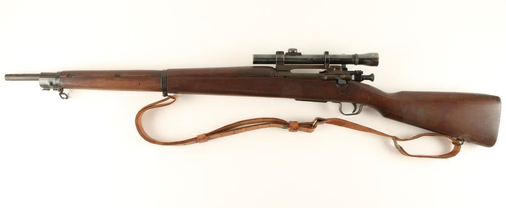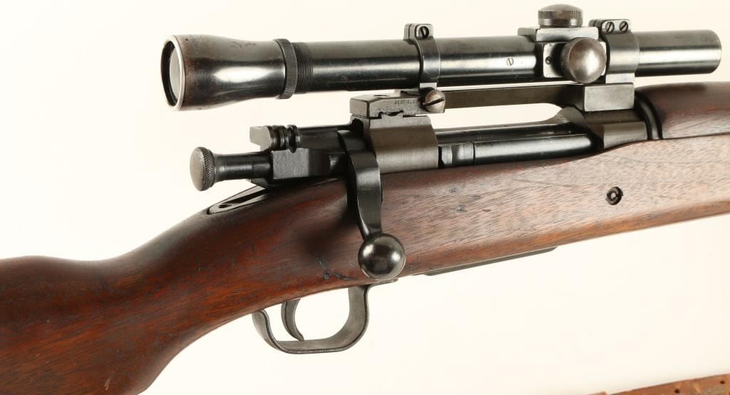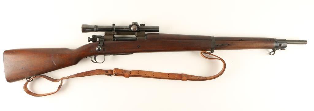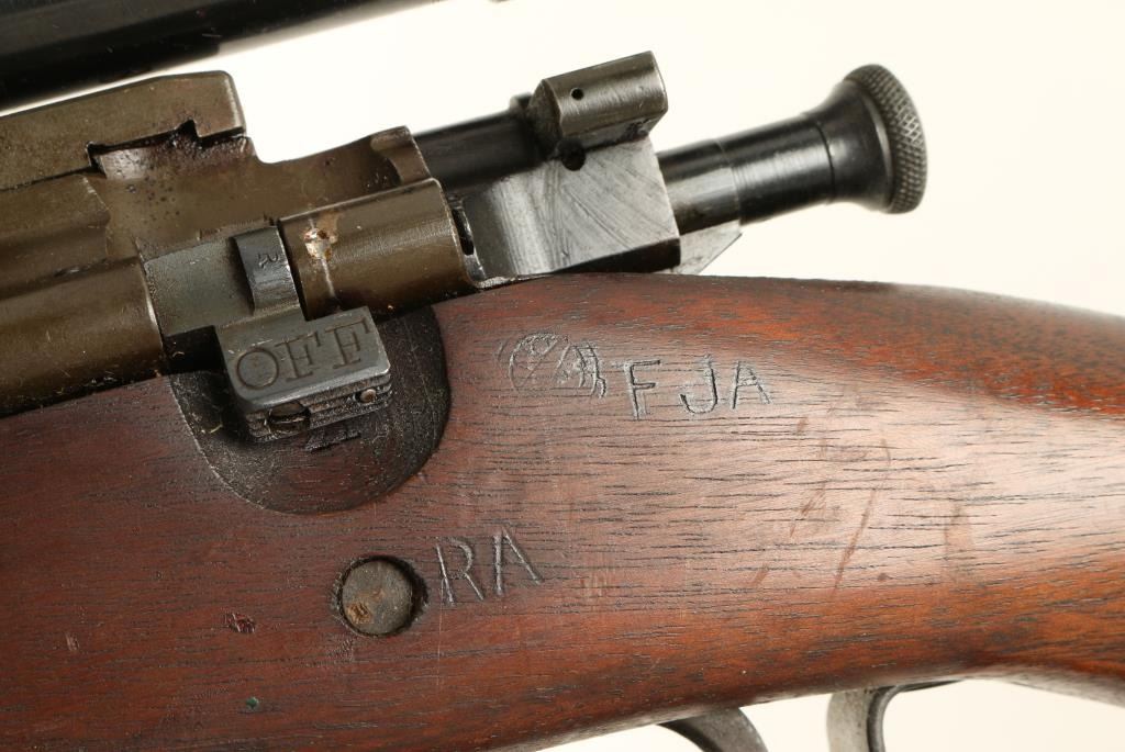 Rebuilt U.S. Military bolt action sniper rifle chambered in .30-06 Springfield, circa 1942. Features a parkerized finish, blued 24" barrel marked "RA(flaming bomb)1-44", removed front sight, Lyman Alaskan 2.5x scope on Redfield base, integral five round box magazine with cut-off switch, blued bolt, smooth trigger, two barrel bands with bayonet lug, brown leather sling, full length smooth walnut forend and semi-pistol grip shoulder stock with circled "P", "F.J.A", "RA", and other small markings. Scope is in very good condition. Rifle retains approximately 95% of it's arsenal refinish and shows light surface rust on the upper barrel band & middle sling swivel. Action is smooth, bore is pristine, and wood stocks are fine. Condition is near excellent. ***C&R Firearm*** ***Modern Firearm***