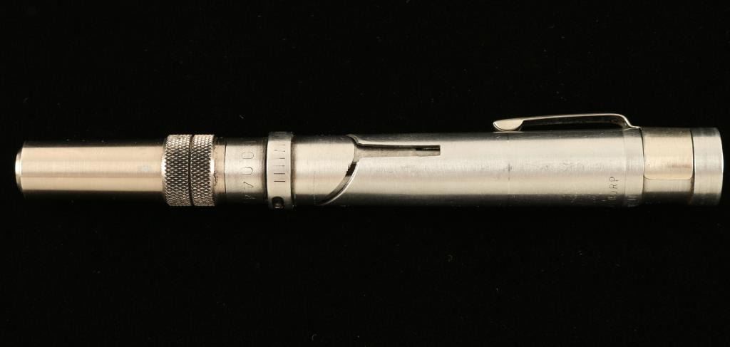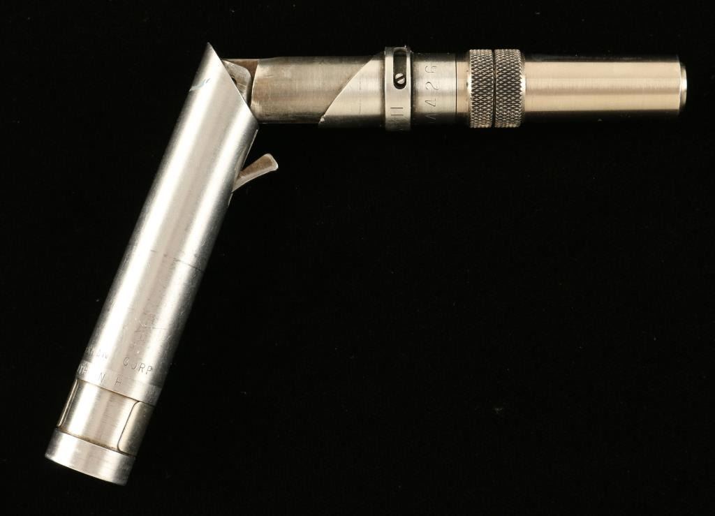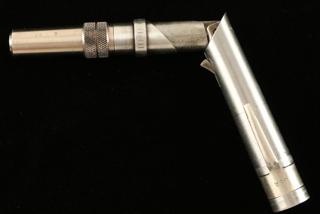 Scarce & inconspicuous stainless steel single shot 'pen gun' chambered in .22 Long Rifle. Features a brushed finish, 2" twist off barrel, rotating safety, pop out trigger, and pocket clip. Pistol shows handling wear and a few small dents. Action performs well and bore is excellent. Condition is very good. ***Modern Firearm***