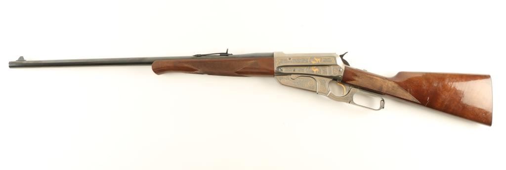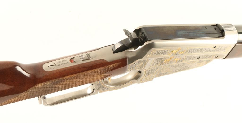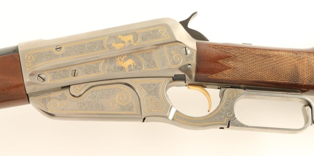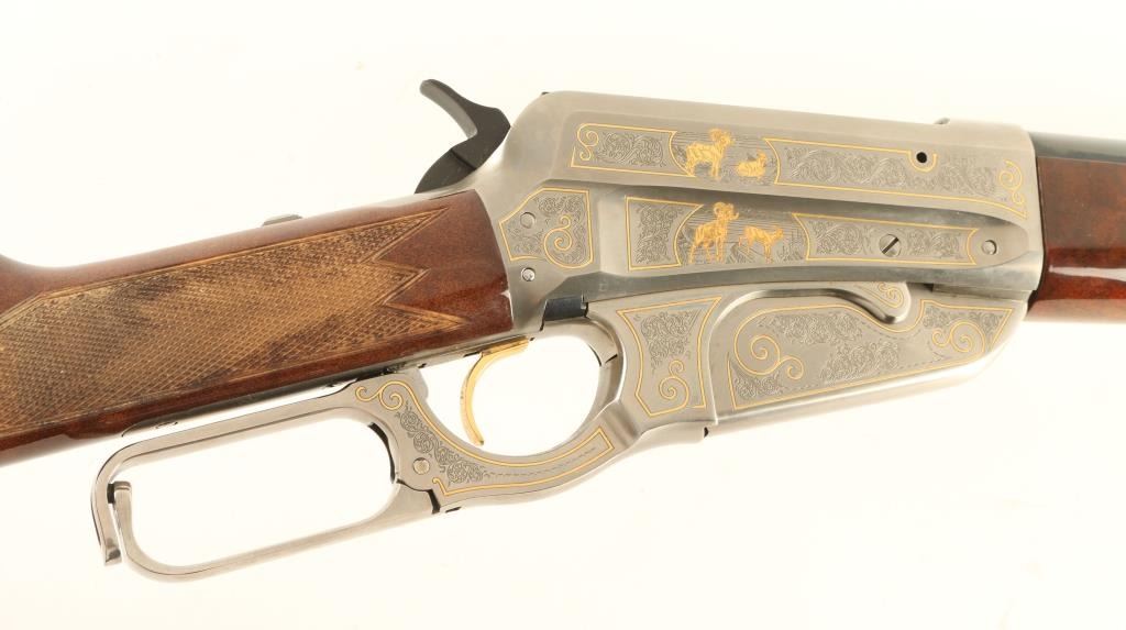'Limited Edition' High grade Japanese made lever action sporting rifle chambered in .30-06 Springfield, circa 1984. One of only 1,000 produced. Features a 24" high polish blued barrel, blade front sight with gold dot, adjustable semi-buckhorn rear sight, scroll engraved stainless steel receiver with wildlife scenes & gold borders, internal magazine, sliding tang safety, checkered high gloss select walnut forend and straight grip shoulder stock with metal buttplate. Barrel shows a small blemish to it's blued finish on the crown and receiver shows no visible wear. Action is smooth bore is pristine and wood stock is very good with a few scratches & small dings. Condition is near excellent. ***Modern Firearm***