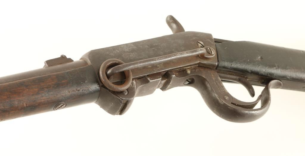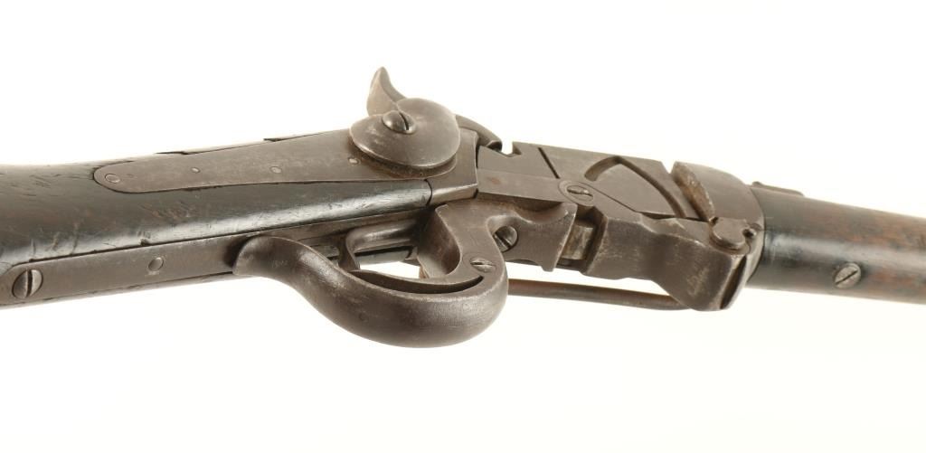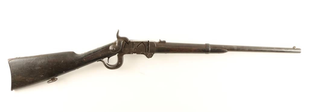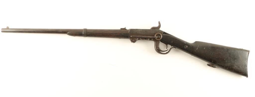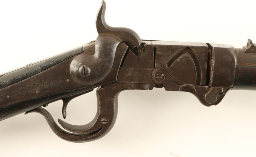'4th Model' Rare & all original Civil War era breech-loading carbine chambered for a proprietary .54 caliber cartridge. One of only 7,000 said to be produced, though seldom encounter today. Features a 21" barrel, blade front sight, folding leaf rear sight(frozen), falling breech lock, smooth trigger, checkered hammer spur, saddle ring, sling swivel, smooth wood forend and straight grip shoulder stock with crescent medal buttplate. Receiver has undergone extensive damage with the right sidewall missing, giving the carbine a cut-away appearance. Rifle has a nice even dark patina with scattered pin prick pitting and is missing the bottom screw from the buttplate. Action functions well, bore is clear and wood stock is near good with a chip & few small cracks at the wrist. Condition is good+. ***Antique Firearm***