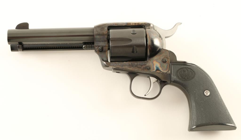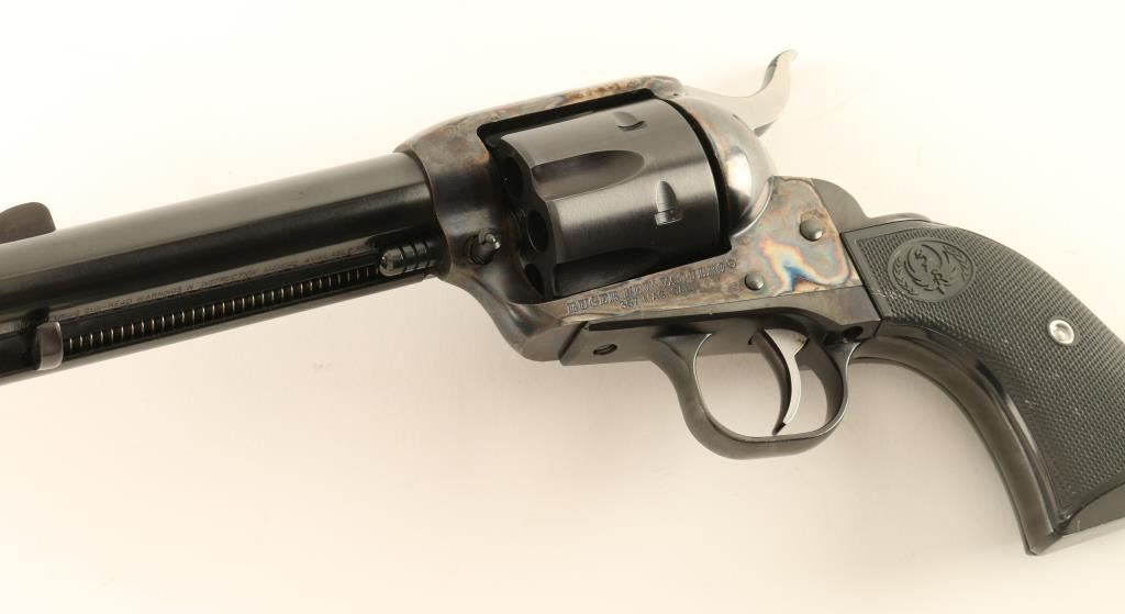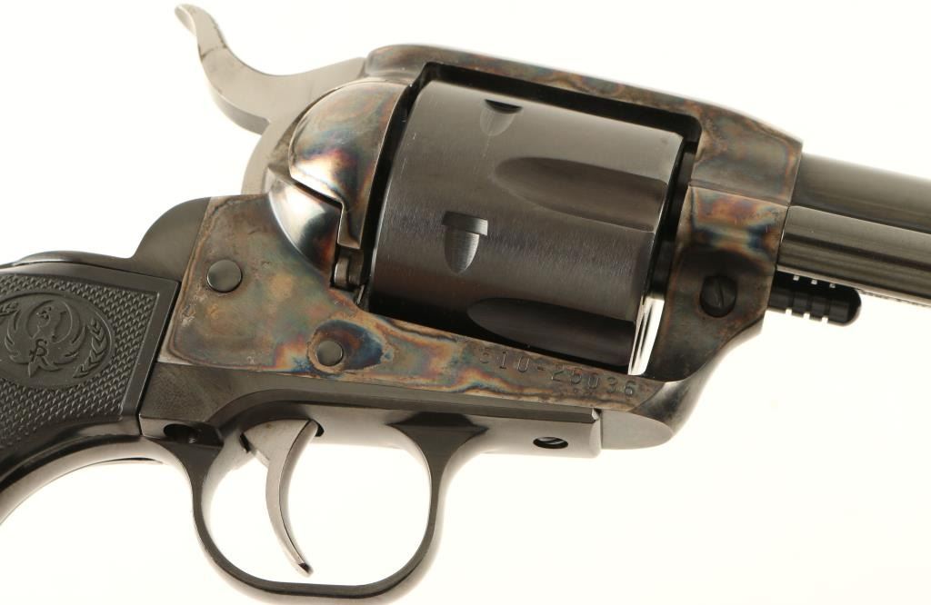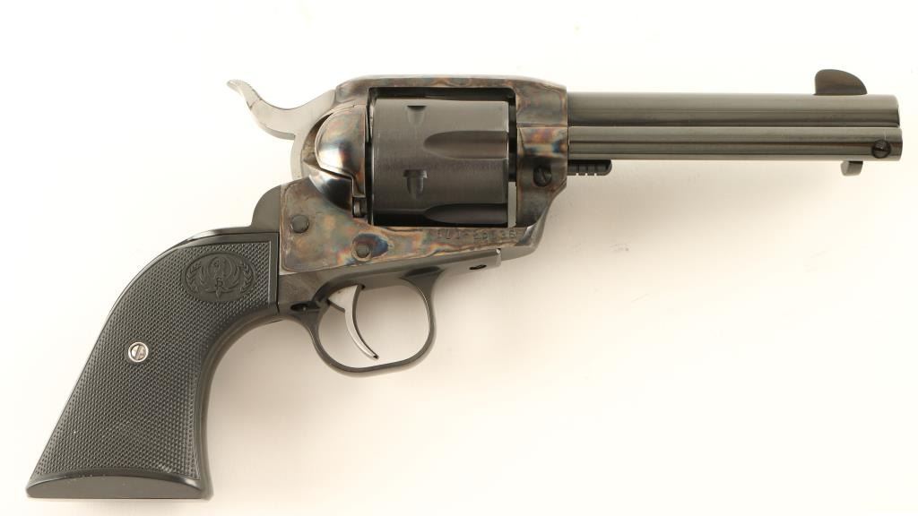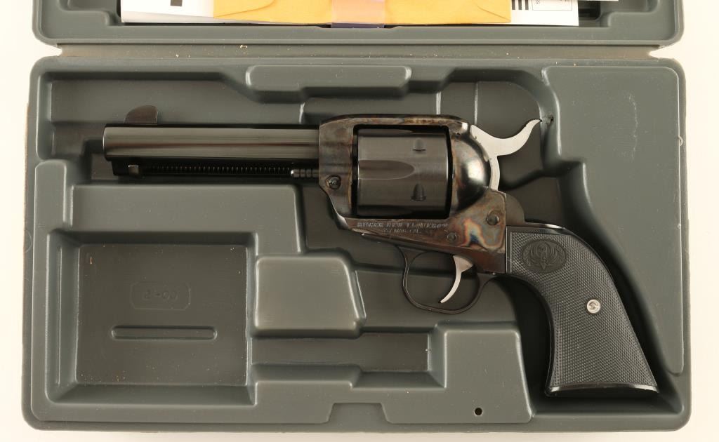 Single action revolver chambered in .357 Magnum, circa 2006. Features a blued & case hardened finish, 4 5/8" barrel, blade front sight, square notched rear sight, ejector rod, fluted six shot cylinder, serrated hammer spur, transfer bar safety, smooth trigger and checkered black plastic grips. Includes the original factory hard case with documents and lock. Finish shows very little use with an extremely fine drag line and a single scratch on the left side of the frame. Action is smooth, bore is excellent and grips are fine. Condition is near new in box. ***Modern Firearm***