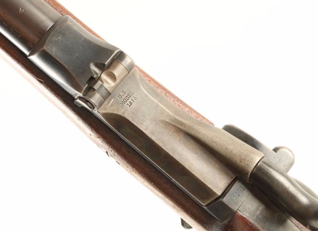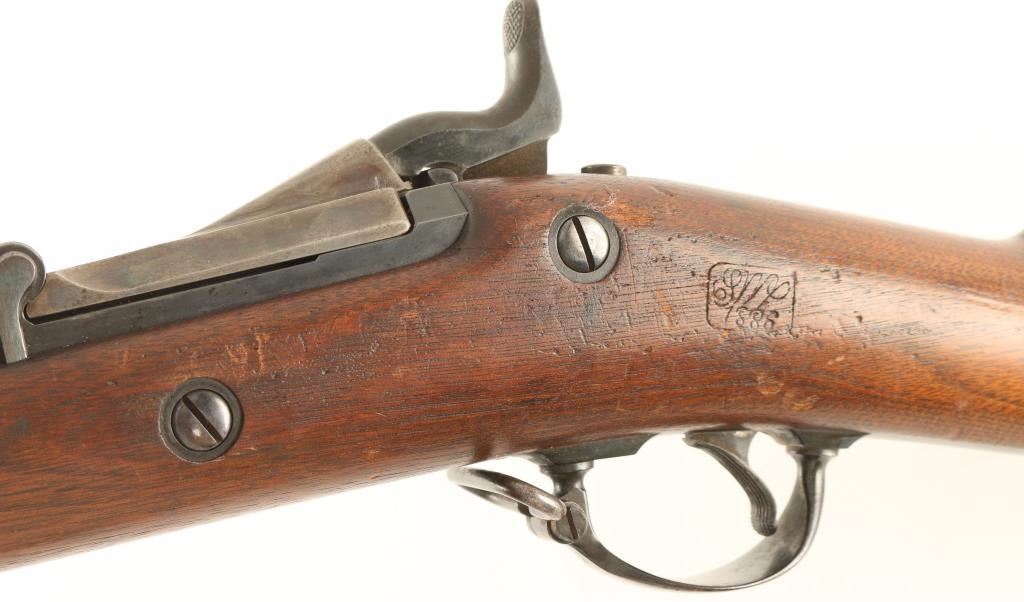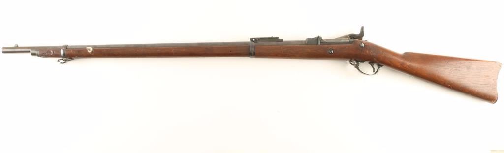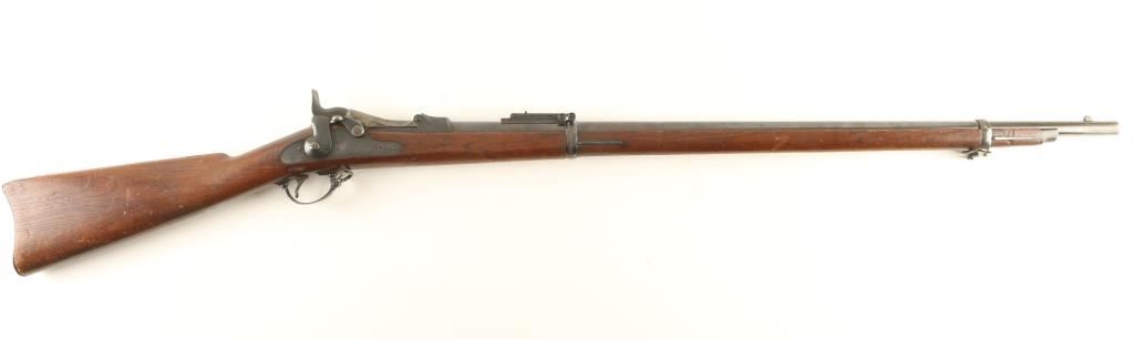 U.S. Military contracted breechloading trapdoor single shot rifle chambered in .45-70. Features a blued 32 5/8" tapered barrel, two barrel bands, blade front sight, Buffington rear adjustable sight, sling swivels, no rod, case hardened breech, serrated trigger, checkered hammer spur, and full length walnut shoulder stock with "U.S." marked metal buttplate. Markings: Breech "U.S./Model/1878", Stock "CB", circled "P", and "SWP / 1886" for Samuel W. Porter. Barrel retains 70% bluing with some finish turning to patina, breech shows good case colors, and lock shows some oxidization over a bright blued finish. Action is sound, bore is excellent, and wood stock is near fine. Condition is excellent. **Antique Firearm***
