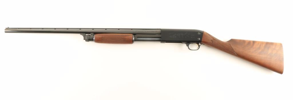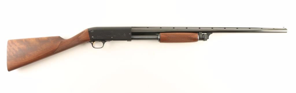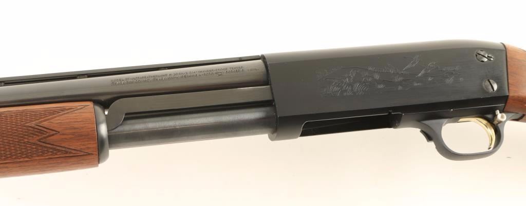 'English Ultra Feather Weight' Slide action bottom ejecting light-weight shotgun chambered for 2 3/4" 20 gauge shells. Features a blued finish, 25" vent rib barrel with improved cylinder choke, bead front sight, engraved aluminum alloy receiver with game scenes, push button safety, gold trigger, tube magazine, checked wood slide handle and English style straight grip shoulder stock. Finish shows little wear with only light drag lines on the magazine tube observed. Action is sound, bore is pristine and wood stocks are fine. Condition is excellent. ***Modern Firearm***
