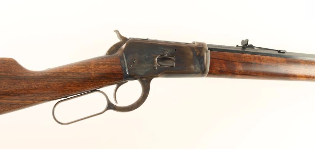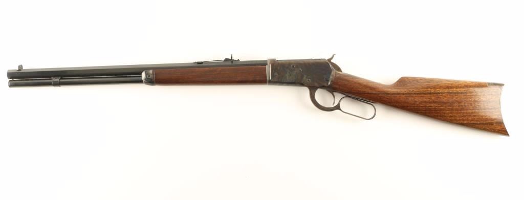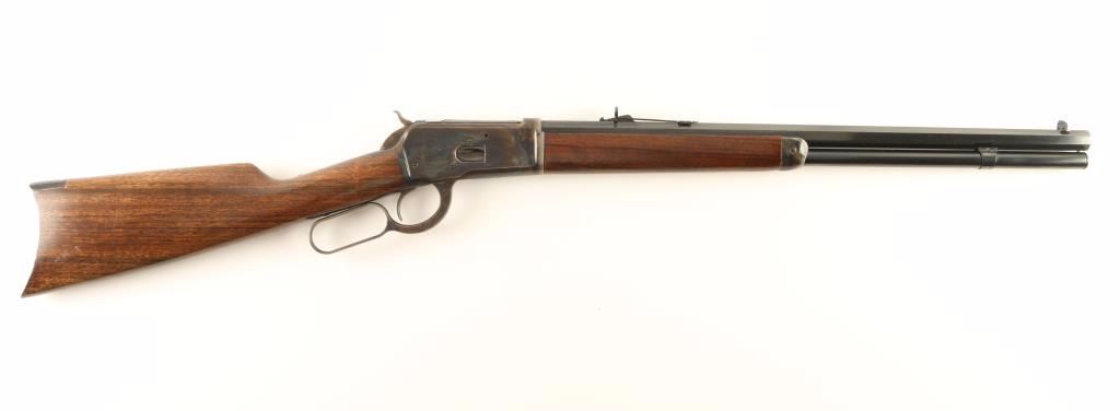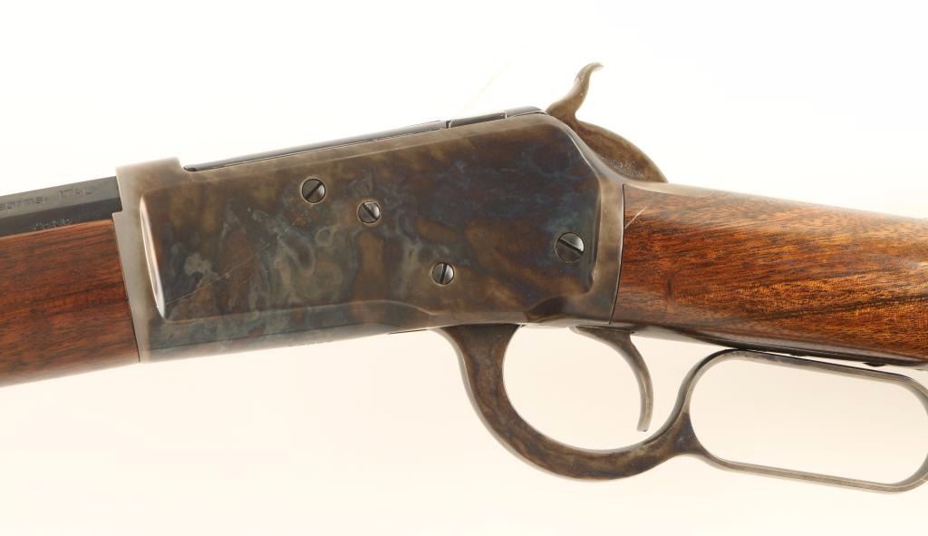 Fine Italian reproduction 1892 Winchester lever action repeating rifle chambered in .357 Magnum. Features a blued 20" octagonal barrel, full tube magazine, dovetailed blade front sight with set screw, semi-buckhorn adjustable rear sight, case hardened receiver, smooth trigger, checkered hammer spur, case hardened forend cap, smooth wood forend and straight grip shoulder stock with crescent buttplate. Rifle shows approximately 97% of it's original finish with single 2" shallow scratch on the receiver. Action is smooth, bore is excellent and wood stocks are fine. Condition is excellent. ***Modern Firearm***