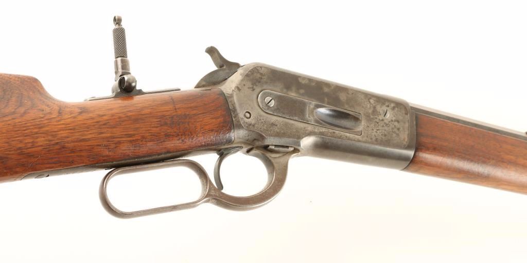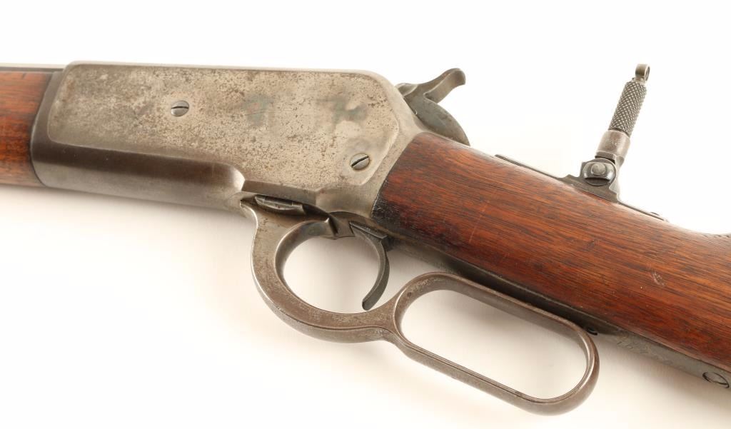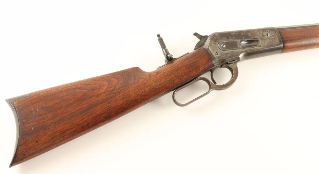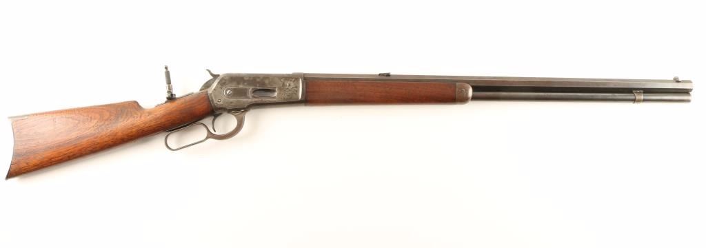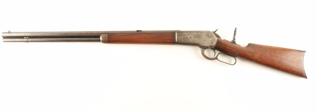 Early lever action repeating rifle chambered in .40-65 Winchester, 1896. Features a blued 26" octagonal barrel, full length tube magazine, blade front sight with ivory bead, folding leaf rear sight, period tang sight, case hardened receiver, smooth trigger, checkered hammer spur, metal forend cap, smooth walnut forend and straight grip shoulder stock with crescent buttplate. Includes a Winchester letter from the Cody Museum with little information. Finish retains 20% original deep bluing on barrel & magazine tube where they meet and a lovely brown patina elsewhere. Receiver & lever boast a small amount of bright colors while the majority of their surfaces are a mixture of reflective silver & dark grey patina. The receiver also exhibits scattered light pin prick pitting on the right side and light scattered surface rust forming on the left side. Also the lower tang appears to have a slight curve causing it to 'push-out' from the center. Markings are mostly crisp and wood stocks are near fine. Action is smooth and bore is good to very good. Condition is Fine. ***Antique Firearm***